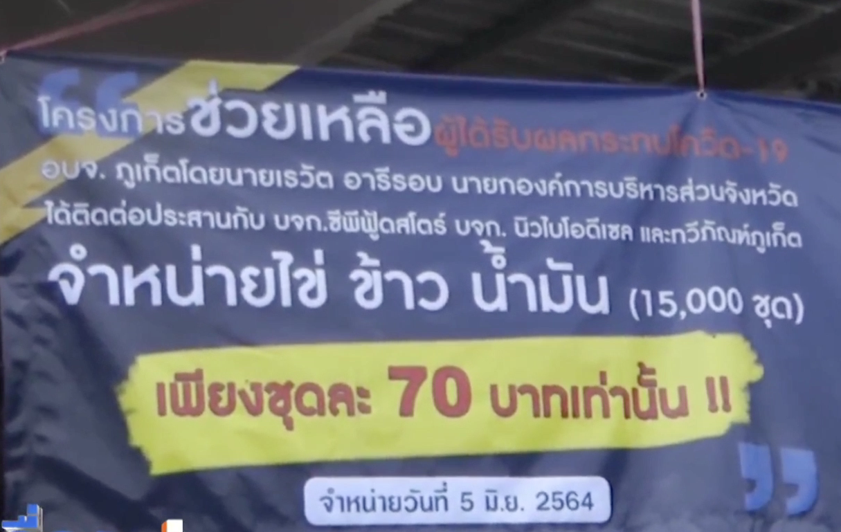 โครงการ “ช่วยเหลือผู้ได้รับผลกระทบโควิด-19” ด้วยการประสานงานกับผู้ผลิตขององค์การบริหารส่วนจังหวัดภูเก็ต นำไข่ไก่ ฟองละ 1 บาท น้ำมันพืช ขวดละ 15 บาท และข้าวสาร กิโลกรัมละ 8 บาท รวมราคาชุดละ 70 บาท มาจำหน่ายให้แก่ประชาชน เพื่อบรรเทาความเดือดร้อนที่เกิดขึ้นจากสถานการณ์โควิด-19 ซึ่งได้รับความสนใจเป็นอย่างมาก แม้ว่าในวันที่จัดจำหน่ายจะมีฝนตกลงมาเป็นระยะๆ หลายคนก็ไม่หวั่น ได้ใส่อุปกรณ์กันฝนมาต่อคิวกันเป็นจำนวนมาก แสดงให้เห็นความเดือดร้อนที่มีจำนวนมาก แต่ด้วยสินค้าที่มีจำกัด จึงทำให้มีทั้งผู้ที่สมหวังและผิดหวัง โดยได้เรียกร้องให้จัดโครงการในลักษณะเช่นนี้อีก