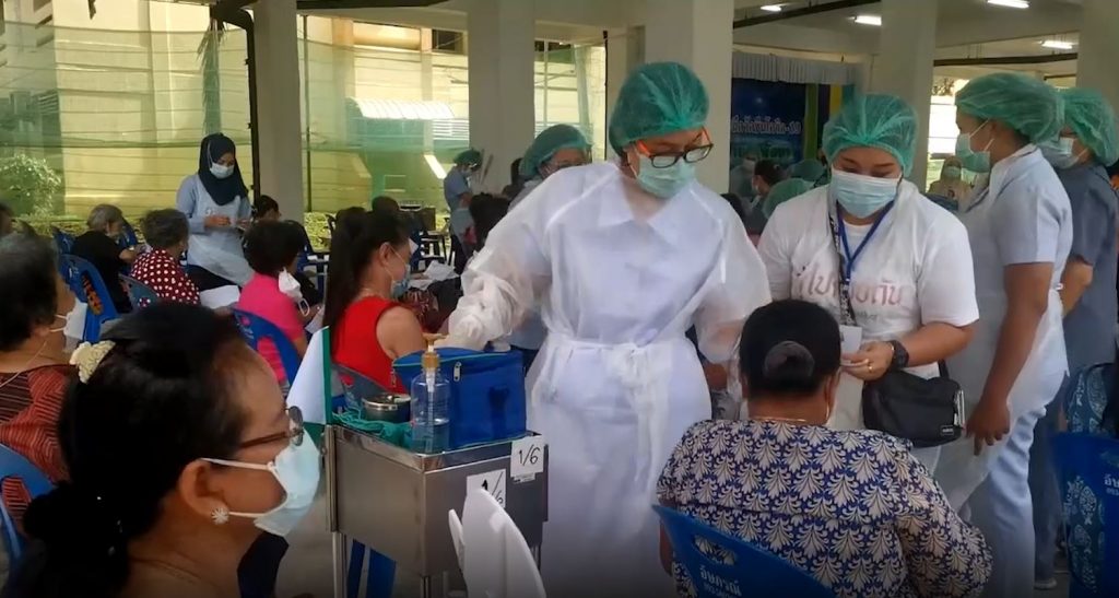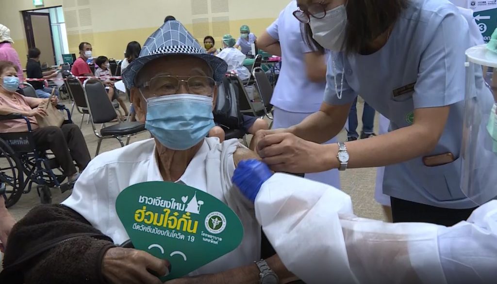 จุดฉีดวัคซีน รพ.นครพิงค์จุดที่ 2 ที่อุทยานหลวงราชพฤกษ์ ที่ จ.เชียงใหม่ วันนี้ยังคงมีผู้สูงอายุและผู้ป่วยกลุ่ม 7 โรคเรื้อรัง เดินทางมาเข้ารับการฉีดกันอย่างต่อเนื่อง ส่วนใหญ่เป็นคุณตาคุณยายที่ลูกหลานพามารับวัคซีน อย่างเช่น คุณตาศรี ณ เชียงใหม่ วัย 93 ปี ซึ่งถือว่าอายุมากที่สุดในวันนี้ บอกว่าอยากฉีด เพื่อความปลอดภัยของตัวเองและครอบครัวและก็ไม่ได้กังวลอะไรถึงเรื่องผลข้างเคียง ที่เชียงใหม่ มีผู้สูงอายุและ7กลุ่มโรคเรื้อรัง ลงทะเบียนผ่านมาระบบหมอพร้อมกว่า 6 หมื่นคน จากจำนวนผู้ลงทะเบียนรับวัคซีนเกือบ 200,000 คน เฉพาะเดือนมิถุนายนได้รับจัดวรรวัคซีนกว่า 100,000 โดส และมีจุดฉีดวัคฉีนทั่วจังหวัด 46 แห่ง จะฉีดวัคซีนได้ราวสัปดาห์ละ 30,000 คน
