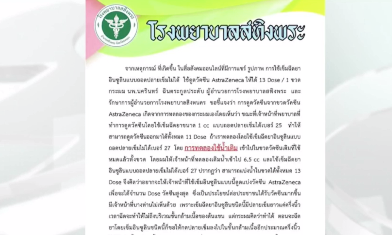 จากกรณีมีการเผยแพร่ข่าวในโลกออนไลน์ว่า โรงพยาบาลแห่งหนึ่งในจังหวัดสงขลา ประกาศขอความร่วมมือเจ้าหน้าที่ใช้เข็มดูดวัคซีนแอสตราเซเนกาจากขวดให้ใช้เข็มฉีดยาอินซูลิน ดูดแบ่งวัคซีนได้ 13 โดส ซึ่งถูกวิพากษ์วิจารณ์อย่างหนัก และจะทำให้ประชาชนไม่ได้รับวัคซีนเพียงพอตามที่กำหนดหรือไม่