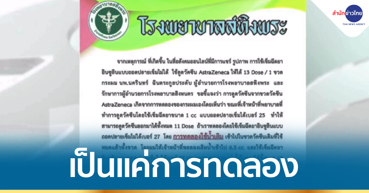 ล่าสุดทาง นพ.นครินทร์ ฉินตระกูล ผู้อำนวยการโรงพยาบาลสทิงพระ และรักษาการผู้อำนวยการโรงพยาบาลสิงหนคร ออกแถลงการณ์ชี้แจงถึงกรณีดังกล่าวว่า เป็นการทดลองของตนเอง โดยใช้เข็มฉีดยาอินซูลินแบบถอดปลายเข็มไม่ได้เบอร์ 27 โดยการทดลองใช้น้ำเติมเข้าไปในขวดวัคซีนที่ใช้หมดแล้วในปริมาณ 6.5 ซีซี