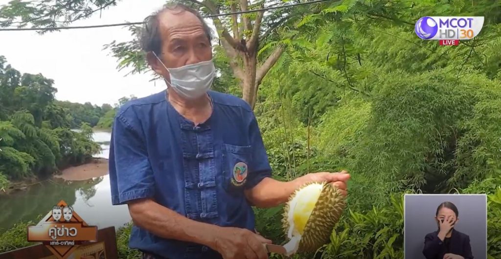 ผู้สื่อข่าวพาไปชมทุเรียนก้านยาวทรงหวดทองผาภูมิ อายุ 40 ปี มีต้นเดียวทั้งสวน ราคาลูกละ 10,000 บาท ยังถูกจองเกือบหมดต้น พร้อมเชิญชวนนักท่องเที่ยวร่วมทานบุฟเฟ่ต์ทุเรียนทองผาภูมิหลากหลายสายพันธุ์ในงานทุเรียนทองผาภูมิ และผลไม้กาญจนบุรี ที่สวนไทรโยค รีสอร์ท บริเวณสวนเกษตร “สมใจนึก” ซึ่งเป็นที่ตั้งของต้นทุเรียนพันธุ์ก้านยาวทรงหวดทองผาภูมิ มีอยู่เพียงต้นเดียว ได้รับความนิยมอย่างสูง เพราะมีรสชาติหวานมัน มีกลิ่นหอมเฉพาะตัว และเมล็ดเล็ก
