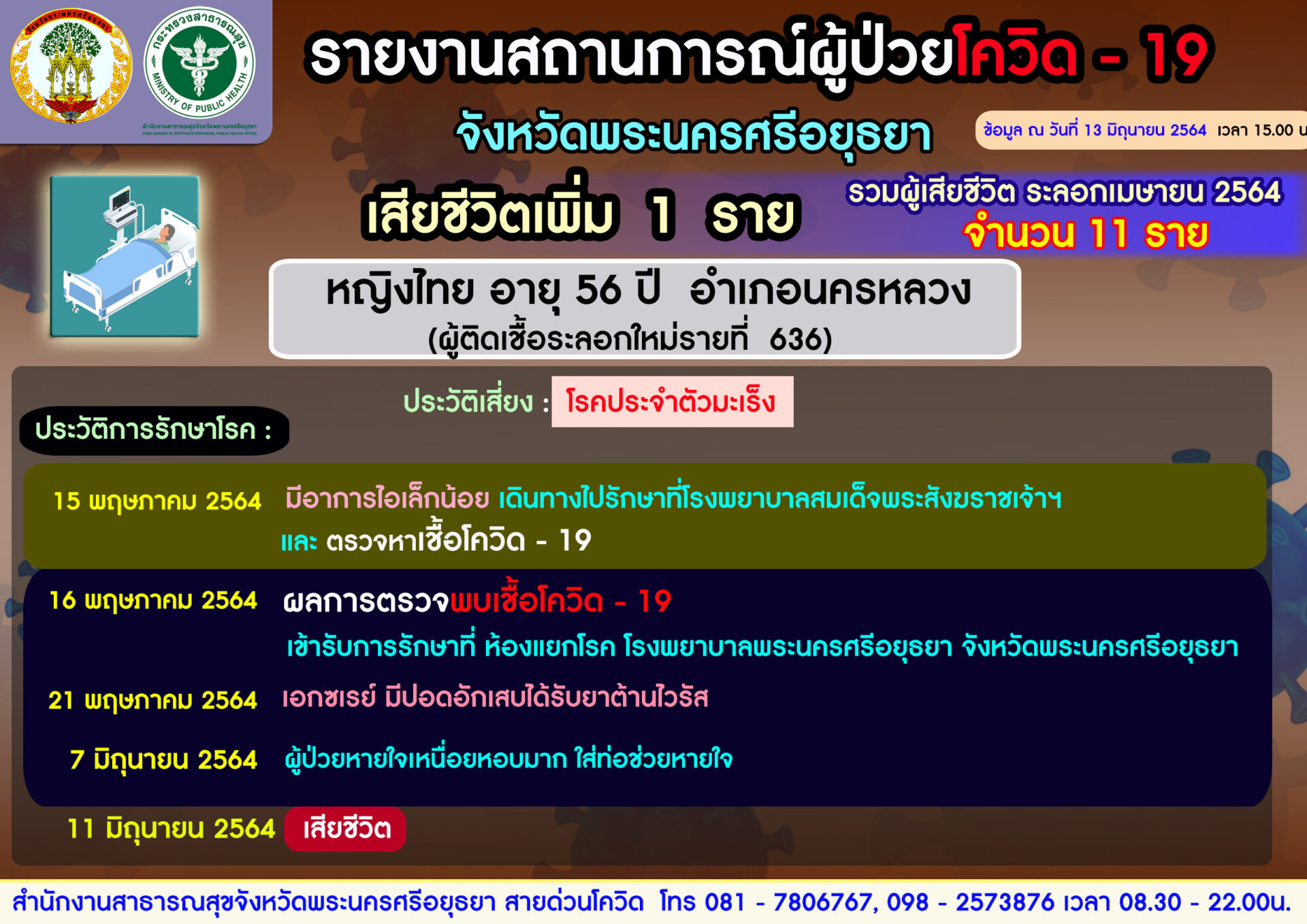 ล่าสุดมีผู้เสียชีวิตเพิ่ม 1 ราย เป็นหญิงอายุ 56 ปี ผู้ติดเชื้อรายที่ 636 ของจังหวัด เป็นประธาน อสม.ตำบลสามไถ อ.นครหลวง จ.พระนครศรีอยุธยา มีโรคประจำตัวเป็นผู้ป่วยมะเร็ง โดยวันที่ 15 พ.ค. มีอาการไอ เดินทางไปรักษาที่โรงพยาบาลสมเด็จพระสังฆราชเจ้าฯ และตรวจหาเชื้อโควิด 16 พ.ค. ผลการตรวจพบติดเชื้อ เข้ารักษาตัวที่โรงพยาบาลพระนครศรีอยุธยา ต่อมา 21 พ.ค. พบปอดอักเสบ ได้รับยาต้านไวรัส 7 มิ.ย. ผู้ป่วยหายใจเหนื่อยหอบ ต้องใส่ท่อช่วยหายใจ กระทั่งเสียชีวิตในวันที่ 11 มิ.ย. – สำนักข่าวไทย