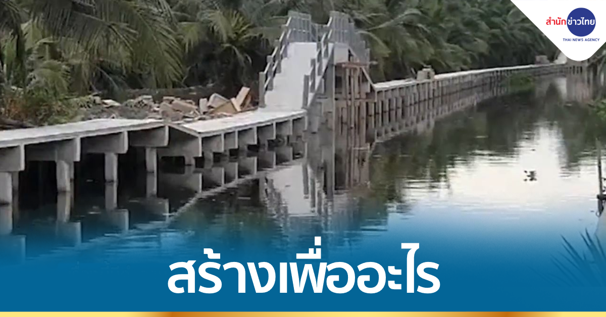 สมุทรสาคร 17 มิ.ย.-ชาวบ้านริมคลองตาปลั่ง อ.บ้านแพ้ว จ.สมุทรสาคร ถามสร้างสะพานทางเท้าคอนกรีต กว้าง 1.2 เมตร ระยะทางครึ่งกิโลเมตร เพื่ออะไร ทั้งที่ไม่มีใครจำเป็นต้องใช้