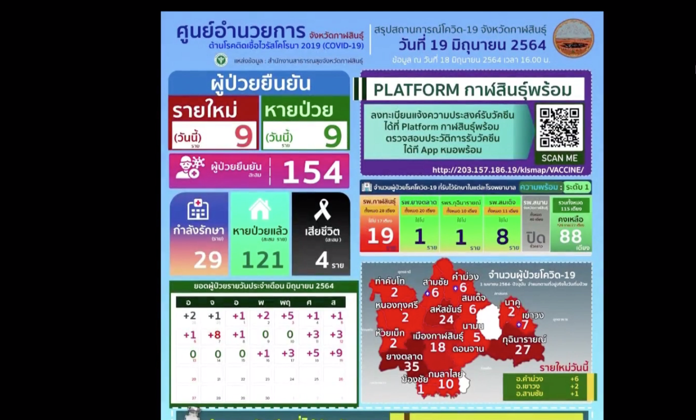 กาฬสินธุ์ 19 มิ.ย.- กาฬสินธุ์พบผู้ติดเชื้อใหม่ 9 คน แต่มีจำนวน 4 คน ที่ป่วยนี้ยังไม่ทราบแหล่งติดเชื้อว่ามาจากที่ใด เบื้องต้นส่งตัวไปรักษาที่โรงพยาบาลพร้อมกักตัวผู้ใกล้ชิด