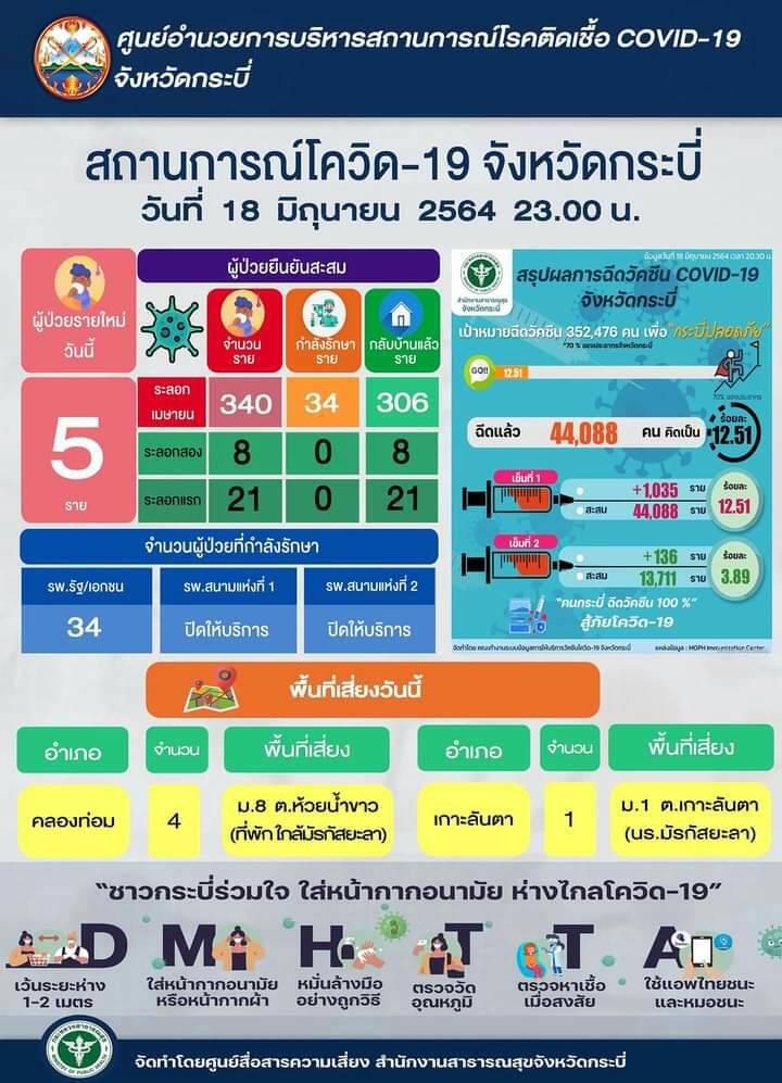 นพ.สมบูรณ์ บุญกิตติชัยพันธ์ รองนายแพทย์สาธารณสุขจังหวัดกระบี่ เปิดเผยว่า ขณะนี้พบ จ.กระบี่ มีกลุ่มผู้ติดเชื้อจากคลัสเตอร์มัรกัสยะลา จำนวน 19 ราย เป็นบุคคลที่มีประวัติเดินทางมาจากพื้นที่เสี่ยงบริเวณใกล้มัรกัสยะลา 4 ราย และเป็นเด็กนักเรียนฮาฟิซ 15 ราย มีผู้สัมผัสเสี่ยงสูงกว่า 50 ราย ซึ่งในส่วนของเด็กนักเรียนนั้นอาจจะเป็นเชื้อโควิด-19 สายพันธุ์ใหม่ ซึ่งจะส่งผลให้การฉีดวัคซีนมีผลในการป้องกันเชื้อลดลง ขณะนี้ได้ส่งตัวอย่างเชื้อไปตรวจหาสายพันธุ์แล้ว คาดว่าใช้เวลาประมาณ 2 สัปดาห์ จึงจะทราบผล