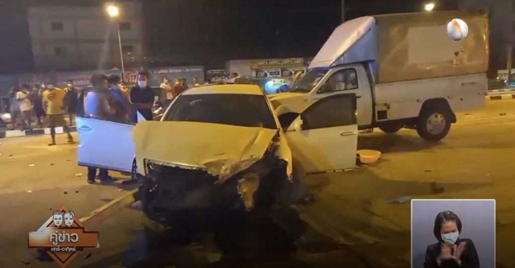จากการตรวจสอบรถเก๋งนิสสัน เทียน่า พบว่าได้ข้ามไปอยู่อีกฝั่งของถนน ก่อนชนรถเก๋ง ตโยต้า ยาริสสีขาว ซึ่งมีคนขับและผู้โดยสารนั่งกันมา 2 คน แต่ทั้งคู่มีอาการบาดเจ็บเล็กน้อยบริเวณใบหน้า คาง และแขน นอกจากนี้ในที่เกิดเหตุยังพบรถอีก 3 คัน ลักษณะชนท้ายต่อๆ กันมา