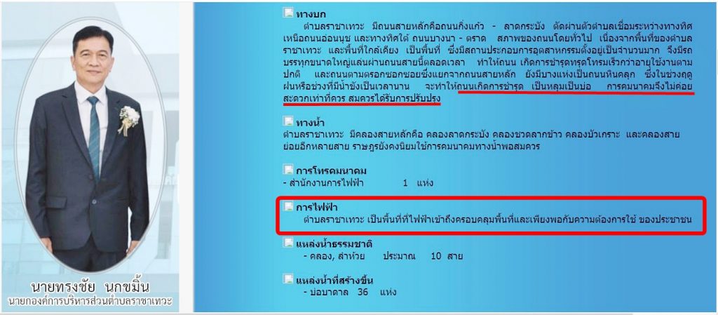 ผู้สื่อข่าวรายงานด้วยว่า จากการตรวจสอบข้อมูลในเว็บไซต์ อบต.ราชาเทวะ (https://rachathewa.go.th/public/infrastructure/data/index/menu/27) ในหมวดข้อมูลสภาพทั่วไปของตำบลราชาเทวะ ระบุว่า ลักษณะโครงสร้างพื้นฐานทางบก ตำบลราชาเทวะมีถนนสายหลัก คือ ถนนกิ่งแก้ว-ลาดกระบัง ตัดผ่านตัวตำบล แต่เนื่องจากในพื้นที่ตำบลราชาเทวะมีโรงงานอุตสาหกรรมตั้งอยู่เป็นจำนวนมาก จึงมีรถบรรทุกขนาดใหญ่แล่นผ่านถนนสายนี้ตลอดเวลา ทำให้ถนนเกิดการชำรุดทรุดโทรมเร็วกว่าอายุใช้งานตามปกติ และถนนตามตรอกซอกซอยยังมีบางแห่งเป็นถนนหินคลุก ซึ่งในช่วงฤดูฝนหรือช่วงที่มีน้ำขังเป็นเวลานาน จะทำให้ถนนเกิดการชำรุด เป็นหลุมเป็นบ่อ การคมนาคมจึงไม่ค่อยสะดวกเท่าที่ควร สมควรได้รับการปรับปรุง