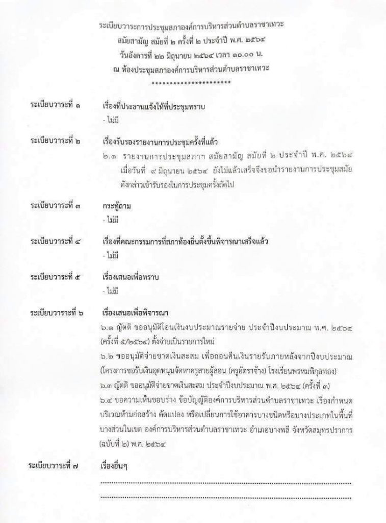 ล่าสุด นายประสิทธิ์ นกขมิ้น ประธานสภา อบต.ราซาเทวะ ได้ลงนามในประกาศแจ้งวันนัดประชุมสภา อบต.สมัยสามัญ สมัยที่ 2 ครั้งที่ 2 ประจำปี พ.ศ.2564 ในวันอังคารที่ 22 มิถุนายนนี้ เวลา 10.00 น. ณ ห้องประทุม สภาองค์การบริหารส่วนตำบลราชาเทวะ ชั้น 4 พร้อมกับเชิญชวนประชาชนที่สนใจเข้ารับฟังการประชุมในวันเวลาและสถานที่ตังกล่าวได้