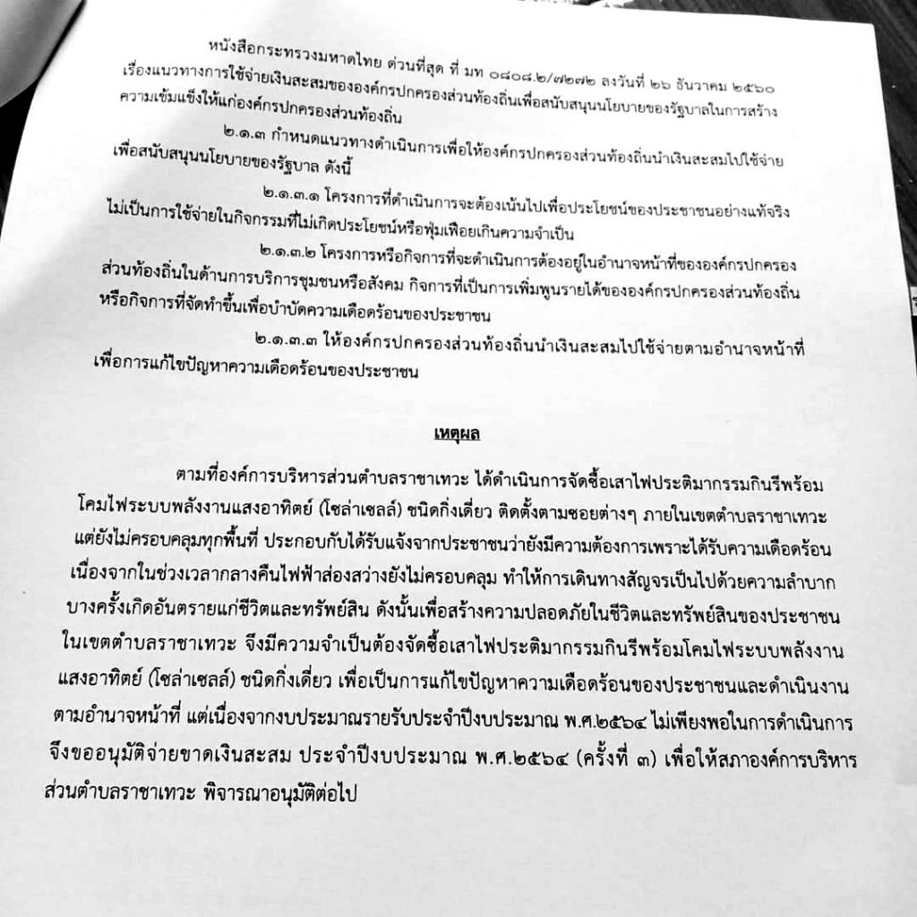 สำหรับระเบียบวาระการประชุมในวันพรุ่งนี้ มีเรื่องน่าสนใจอยู่ที่ระเบียบวาระที่ 6 เป็นเรื่องเสนอเพื่อพิจารณา รวม 4 เรื่อง โดย 1 ในนั้นคือ ญัตติขออนุมัติจ่ายขาดเงินสะสม ประจำปีงบประมาณ พ.ศ.2564(ครั้งที่3) ที่นายทรงชัย นกขมิ้น นายก อบต.ราชาเทวะ ทำเรื่องเสนอต่อสภา อบต.ขออนุมัตินำเงินสะสมของ อบต.จำนวน 68.4 ล้านบาท มาจ่ายเป็นค่าจัดซื้อเสาไฟประติมากรรมกินรี พร้อมโคมไฟระบบพลังงานแสงอาทิตย์(โซลาร์เซลล์) เพิ่มเติมอีก 720 ต้น ราคาต้นละ 95,000 บาท เพื่อติดตั้งภายในเขตตำบลราชาเทวะ