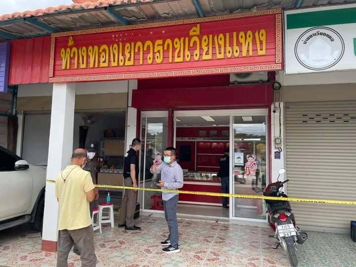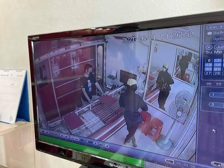 ภาพจากกล้องวงจรปิดในร้านห้างทองเยาวราชเวียงแหง ตำบลเวียงแหง อำเภอเวียงแหง ที่เชียงใหม่ เมื่อช่วงบ่ายโมงเศษ วันนี้ (21 มิ.ย.) จะเห็นคนร้าย เป็นชายสวมเสื้อผ้ามิดชิด ใส่หน้ากากอนามัย และใช้ผ้าโพกหัว ทำทีเป็นลูกค้า เข้าไปดูทองเลือกลายสร้อยทองภายในร้าน ไม่นานล้วงปืนขึ้นมาข่มขู่และพยายามจะกระโดดขึ้นไปบนกระจกตู้ทอง แต่เจ้าของร้านทองพยายามต่อสู้ขัดขวางคนร้ายโดยพยายามใช้เก้าอี้ฟาดแต่คนร้ายตะโกนข่มขู่ และใช้ปืนยิงเข้าใส่แต่กระสุนด้าน ก่อนข้ามตู้กระจกไปด้านหลังได้สำเร็จ และใช้ค้อนและก้อนหินทุบกระจกตู้ทองด้านหลัง กวาดสร้อยคอทองคำน้ำหนัก 1บาทไปได้ 20 เส้น ก่อนคนร้ายจะวิ่งหนีไปขึ้นมอเตอร์ไซค์สีดำ ที่คนร้ายอีกคนสตาร์ทเครื่องรออยู่ หลบหนีไป ทางซอยคริสจักรเวียงแหง
