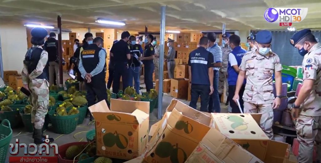 จากการตรวจสอบพบล้งดังกล่าวมีชื่อรับซื้อมังคุด แต่ในล้งกลับมีทุเรียน คล้ายกับพันธุ์หมอนทอง วางกองอยู่เต็มล้ง โดยมีคนงานกำลังบรรจุทุเรียนใส่ลงในกล่องกระดาษ นอกจากนี้ยังพบทุเรียนที่บรรจุกล่องแล้วถูกจัดเรียงอยู่เต็มตู้คอนเทนเนอร์ และยังพบมีการปลอมแปลงเปลี่ยนสติกเกอร์ที่ขั้วผลทุเรียน เพื่อใช้สวมสิทธิเป็นทุเรียนไทย เตรียมส่งออกไปยังประเทศจีน ขณะที่ผู้ประกอบการได้สำแดงเอกสารอ้างว่านำมาแปรรูปจำนวน 18 ตัน หรือประมาณ 1 ตู้คอนเทนเนอร์