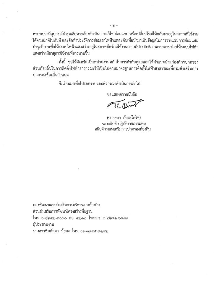 2.อปท.ควรดำเนินการติดตั้งเสาไฟฟ้าแสงสว่างบนถนนให้เป็นไปตามมาตรฐานไฟฟ้าสาธารณะของกรม สถ.และมาตรฐานอื่นที่เกี่ยวข้อง โดยมุ่งเน้นเรื่องความปลอดภัยในการสัญจรของผู้ใช้ถนนในเวลากลางคืนเป็นหลัก มีรูปแบบการติดตั้งเสาไฟฟ้าสาธารณะตามแนวถนน ทางแยก วงเวียน เป็นไปตามมาตรฐานที่กำหนด และการออกแบบระยะการติดตั้งเสาไฟฟ้า ต้องมีการคำนวณระยะห่างของเสาไฟฟ้าตามสูตรที่กำหนดไว้ในมาตรฐาน เพื่อให้ได้ระยะห่างของเสาไฟฟ้าที่ให้ค่าความส่องสว่างที่เหมาะสมไม่สูงเกินไปกว่าความจำเป็นในการใช้งานในพื้นที่ และมีทิศทางการส่องสว่างของแสงจากไฟส่องสว่างสาธารณะที่เหมาะสม ไม่รุกล้ำไปยังพื้นที่ส่วนบุคคล ซึ่งอาจกระทบต่อสุขภาพของประชาชนที่อาศัยอยู่บริเวณริมถนน