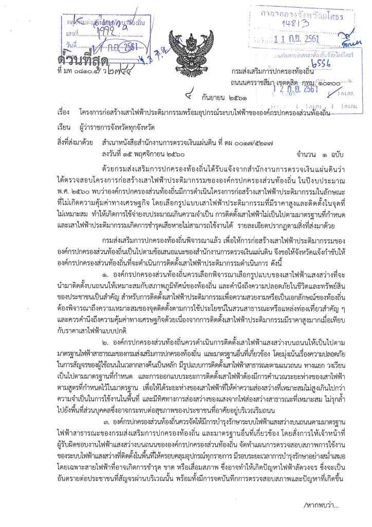 สำนักข่าวไทยตรวจสอบพบว่า หลังจากอธิบดี สถ.ได้รับแจ้งข้อเสนอแนะดังกล่าวจาก สตง.แล้ว ก็ได้ทำหนังสือด่วนที่สุด เมื่อวันที่ 4 ก.ย.2561 แจ้งผู้ว่าราชการจังหวัดทุกจังหวัดว่า เนื่องจาก สตง.ได้ทำการตรวจสอบโครงการก่สร้างเสาไฟฟ้าประติมากรรมของ อปท.ในปีงบประมาณ พ.ศ.2560 พบว่ามีการดำเนินโครงการในลักษณะที่ไม่เกิดความคุ้มค่าทางเศรษฐกิจ มีการเลือกรูปแบบเสาไฟฟ้าประติมากรรมที่มีราคาสูงและติดตั้งในจุดที่ไม่เหมาะสม ทำให้เกิดการใช้จ่ายงบประมาณเกินความจำเป็น การติดตั้งเสาไฟฟ้าไม่เป็นไปตามมาตรฐานที่กำหนด และเสาไฟฟ้าประติมากรรมเกิดการชำรุดเสียหายไม่สามารถใช้งานได้ สถ.จึงขอให้ทุกจังหวัดแจ้งกำชับให้ อปท.ที่จะดำเนินการติดตั้งเสาไฟฟ้าประติมากรรมดำเนินการ ดังนี้