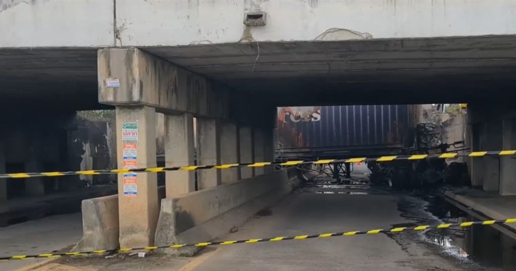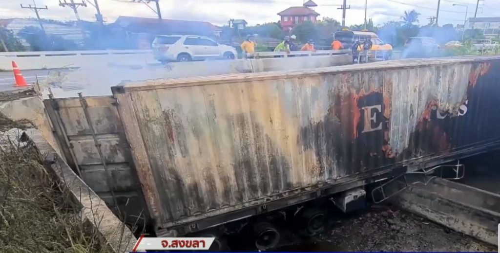 ตรวจสอบที่เกิดเหตุพบรถเทรลเลอร์บรรทุกตู้คอนเทนเนอร์ หัวลากยี่ห้ออีซูซุ สีขาว หมายเลขทะเบียน 71-9422 สงขลา ตกไปอยู่บนถนนใต้สะพาน ความสูงจากถนนเกือบ 3 เมตร และไฟลุกท่วมอย่างรุนแรงทั้งคัน เจ้าหน้าที่ต้องระดมรถดับเพลิงนับสิบคัน ช่วยกันดับเพลิงใช้เวลานับสิบชั่วโมงแล้ว
