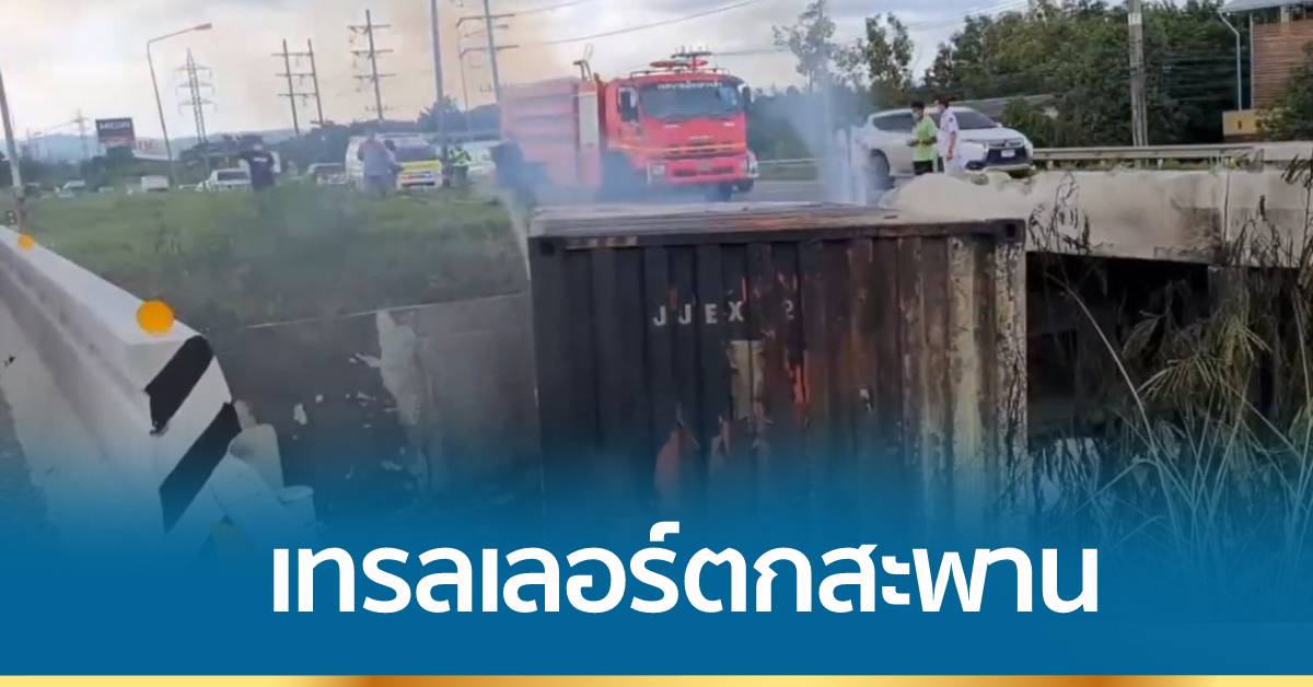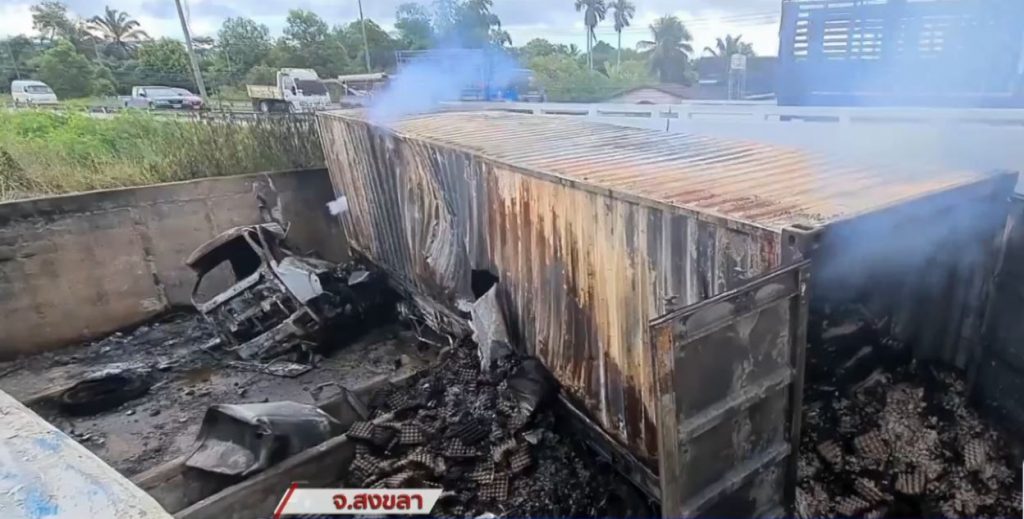 เมื่อช่วงกลางดึกที่ผ่านมา ตำรวจ สภ.หาดใหญ่ จ.สงขลา รับแจ้งอุบัติเหตุรถเทรลเลอร์บรรทุกตู้คอนเทนเทนเนอร์ ชนหัวสะพานลอดอุโมงค์บ้านหน้าควน ถนนสายเอเชีย ต.ควนลัง อ.หาดใหญ่ ฝั่งขาไป จ.พัทลุง แล้วตกจากสะพานเกิดระเบิดไฟลุกไหม้
