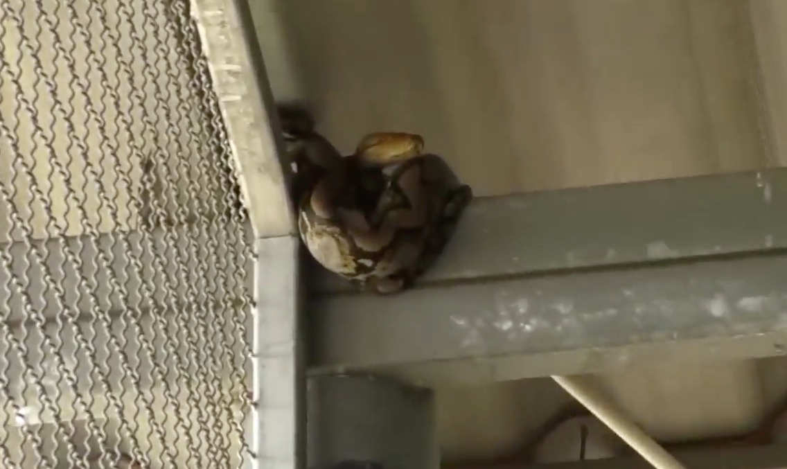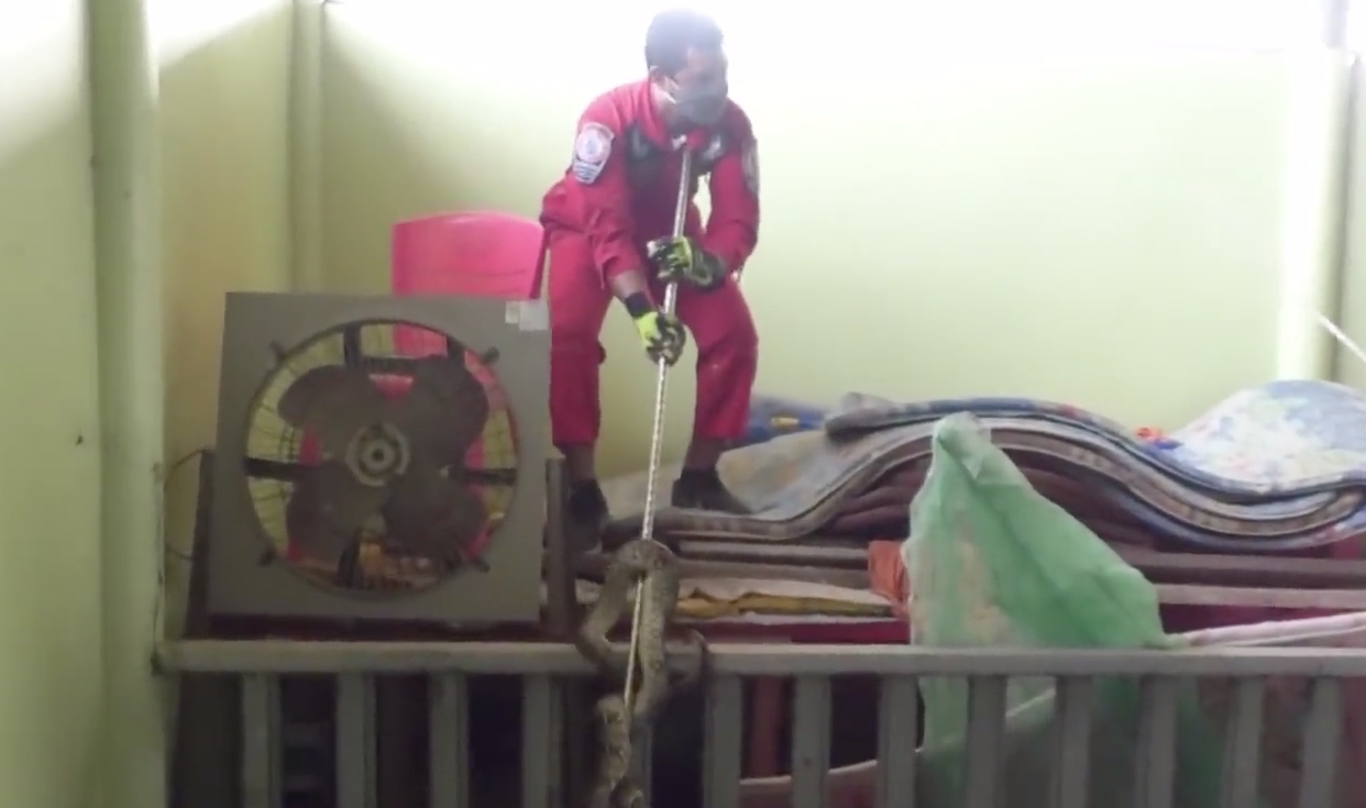 สมุทรสงคราม 24 มิ.ย.- งูเหลือมบุกศาลาการเปรียญวัดลาดเป้ง จ.สมุทรสงคราม จึงแจ้งเจ้าหน้าที่เข้าจับด้วยความทุลักทุเลทั้งฉี่ทั้งอึใส่เจ้าหน้าที่