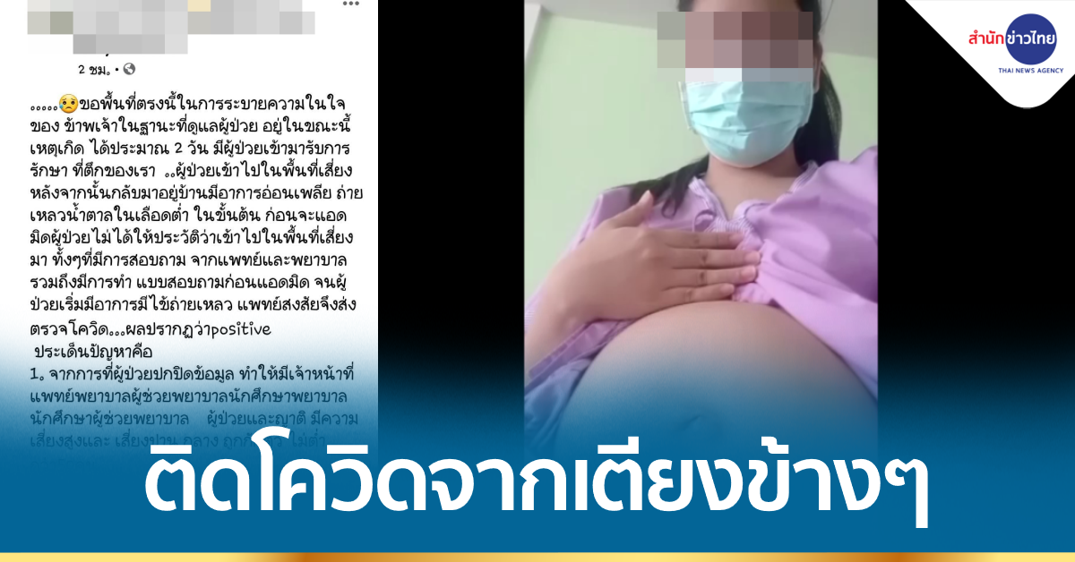 ผู้ป่วยหญิงซึ่งพักรักษาตัวอยู่ใน รพ.แห่งหนึ่งในจังหวัดอ่างทอง ได้โพสต์คลิปวิดีโอเผยแพร่ทางโซเชียลมีเดีย เล่าเรื่องราวที่ทำให้เธอช็อก หลังเข้ามารักษาโรคเบาหวานที่ รพ.นี้ แต่ต่อมากลับพบว่าตัวเธอตรวจเจอเชื้อโควิด คาดว่าติดจากผู้ป่วยเตียงข้างๆ ที่ปกปิดข้อมูล ไม่ยอมแจ้งแพทย์และเจ้าหน้าที่ว่าเคยไปพื้นที่เสี่ยงก่อนมารักษาตัวที่ รพ.