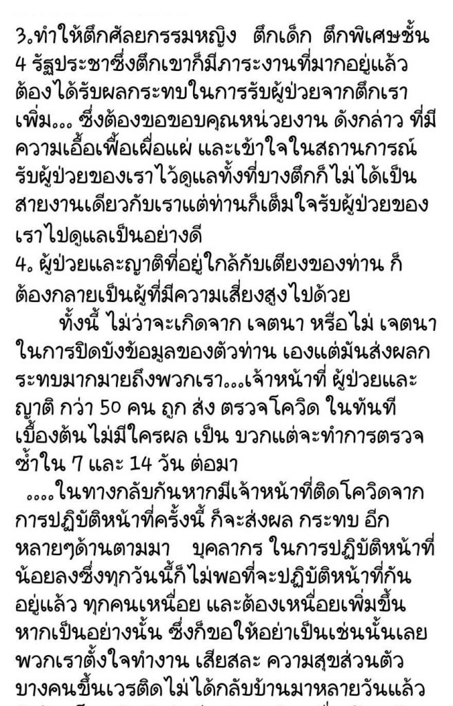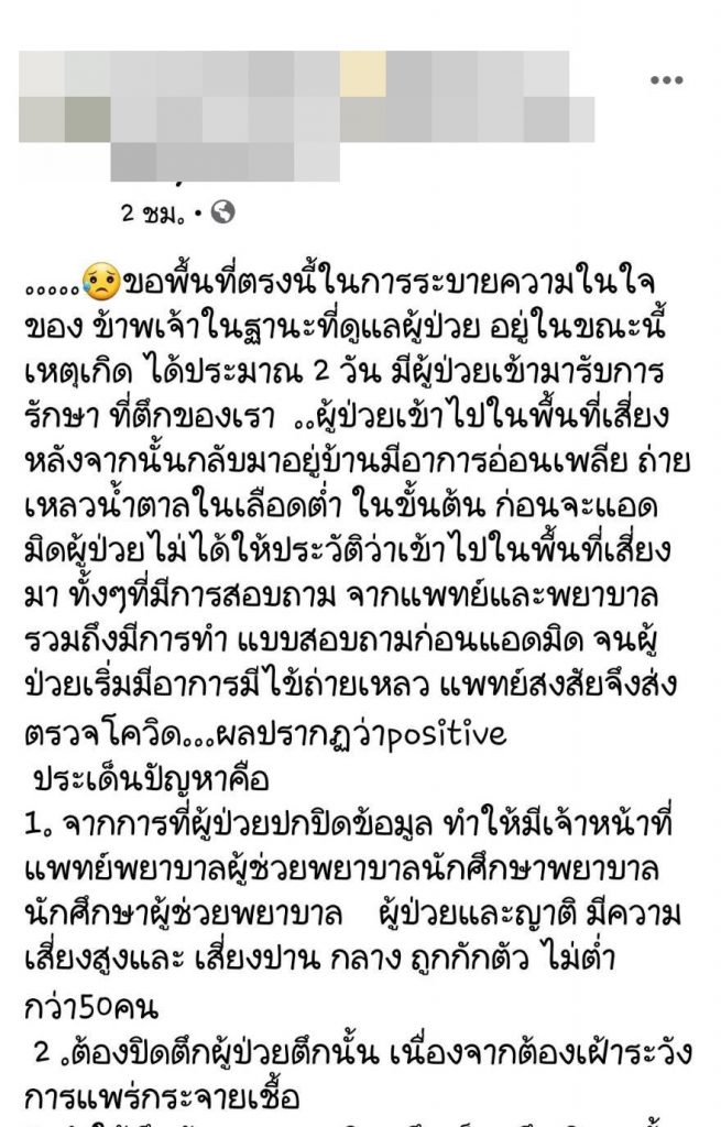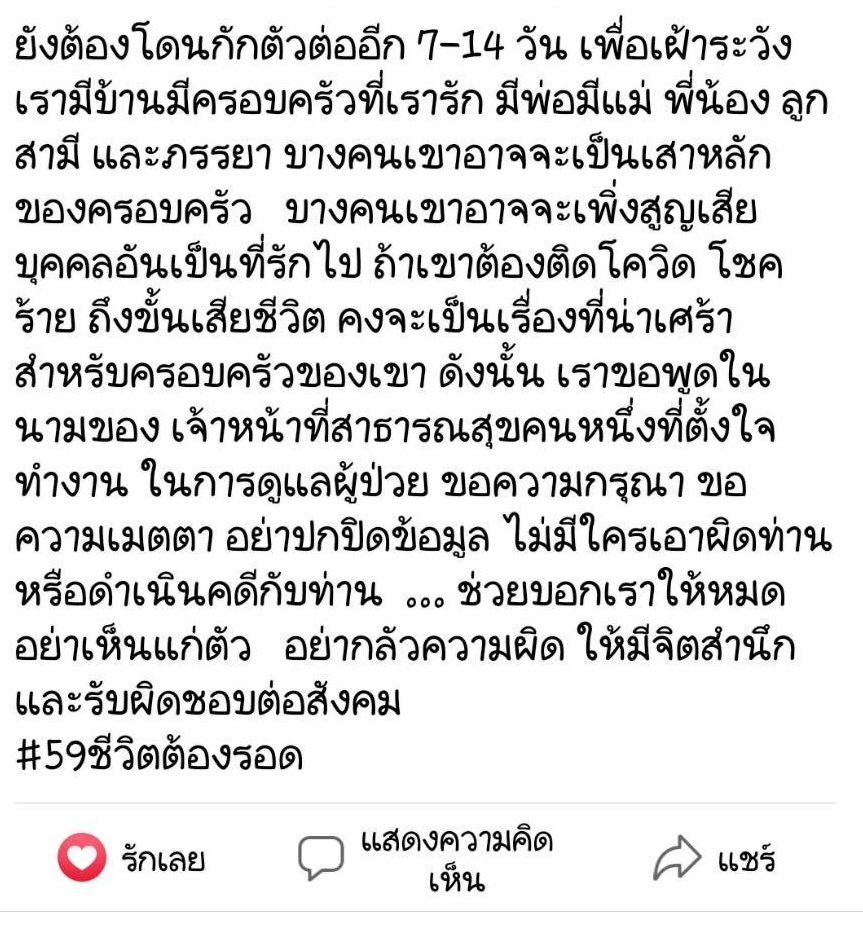 ขณะที่บุคลากรทางการแพทย์รายหนึ่งของ รพ.แห่งนี้ ก็ได้โพสต์เฟซบุ๊กถึงเรื่องผู้ป่วยที่เข้ามารักษาปกปิดข้อมูล จนทำให้เจ้าหน้าที่ทางการแพทย์ ผู้ป่วย รวมไปถึงญาติผู้ป่วย ต้องถูกกักตัวถึง 50 คน และต้องปิดตึกผู้ป่วยเพื่อเป็นการป้องกันการแพร่กระจายเชื้อ อีกทั้งยังเพิ่มภาระให้กับโรงพยาบาลในจุดอื่นๆ ทำให้ส่งผลกระทบเป็นวงกว้าง จึงขอให้ผู้ป่วยอย่าปกปิดข้อมูล พร้อมกับติดแฮชแท็ก “#59ชีวิตต้องรอด” ซึ่งมีผู้เข้ามาแสดงความคิดเห็นและให้กำลังใจเจ้าหน้าที่เป็นจำนวนมาก รวมถึงตำหนิผู้ป่วยที่ปกปิดข้อมูล ทำให้เกิดความเสียหาย โดยบางรายถึงกับอยากให้ดำเนินคดีกับผู้ที่ปกปิดข้อมูลด้วย.-สำนักข่าวไทย