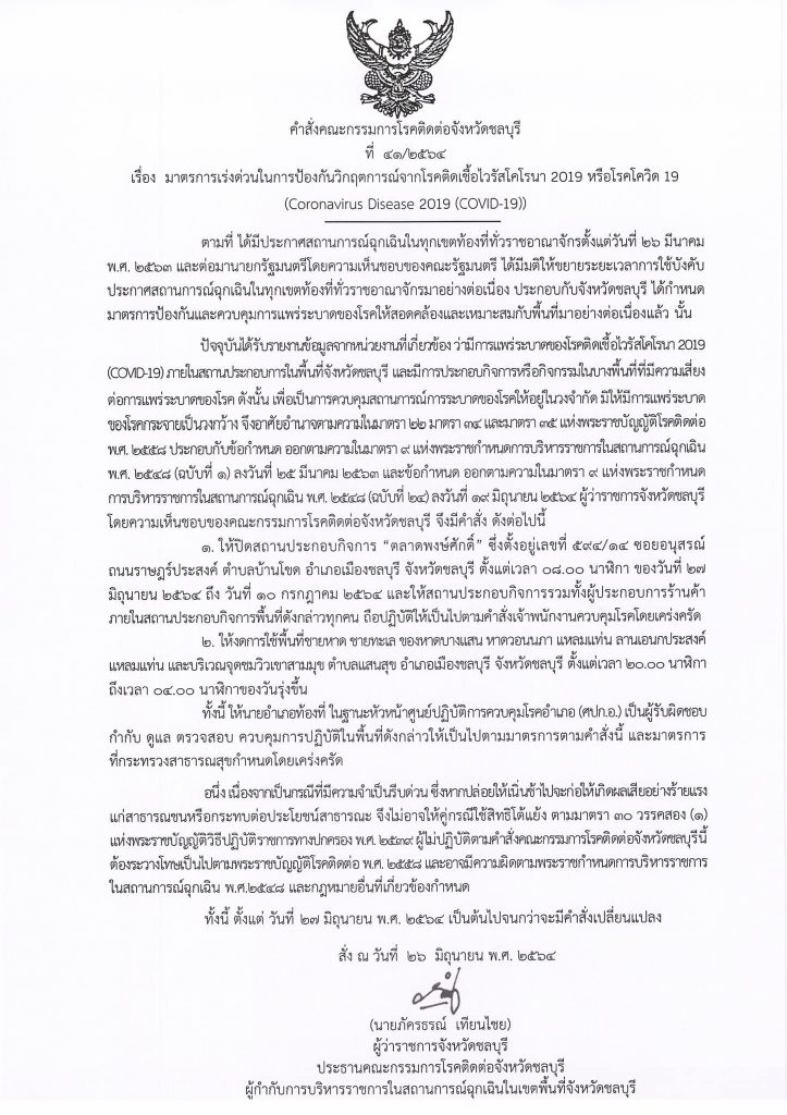 1.ให้ปิดสถานประกอบกิจการ “ตลาดพงษ์ศักดิ์” ตั้งอยู่ถนนราษฎร์ประสงค์ ตำบลบ้านโขด อำเภอเมืองชลบุรีจังหวัดชลบุรี ตั้งแต่เวลา 08.00 น. ของวันที่ 27 มิถุนายน 2564 ถึงวันที่ 10 กรกฎาคม 2564 และให้สถานประกอบกิจการรวมทั้งผู้ประกอบการร้านค้าภายในสถานประกอบกิจการพื้นที่ดังกล่าวทุกคน ถือปฏิบัติให้เป็นตามคำสั่งเจ้าพนักงานควบคุมโรคโดยเคร่งครัด