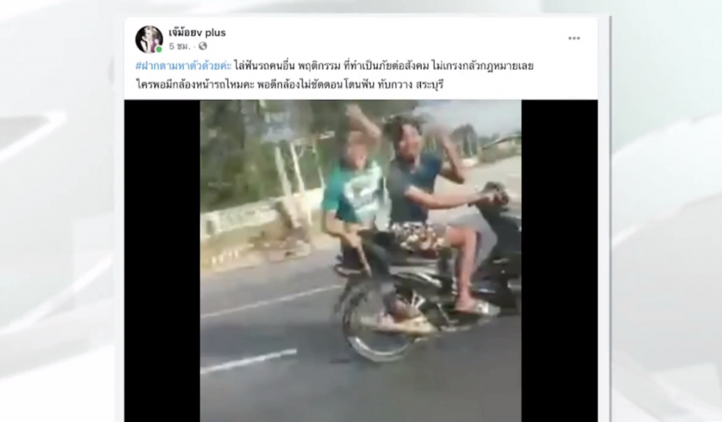 เพจเฟสบุ๊ก เจ๊ม้อย v plus โพสต์ภาพเหตุการณ์ไล่ฟันรถคนอื่นพฤติกรรมที่ทำเป็นภัยต่อสังคม ไม่เกรงกลัวกฎหมายเลย ใครพอมีกล้องหน้ารถไหมคะ พอดีกล้องไม่ชัดตอนโดนฟันทับกวาง สระบุรี จากคลิปจะเห็น ว่ามีรถจักรยานยนต์ขี่ซ้อนสอง ขับไล่ตามรถกระบะไปตามถนน สายทับกวาง จ.สระบุรี ก่อนที่คนซ้อนจะใช้มีดไล่ฟันกระบะด้านซ้ายหลายครั้ง