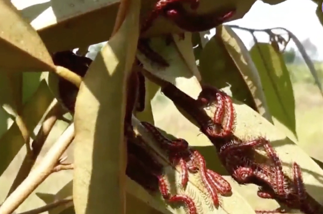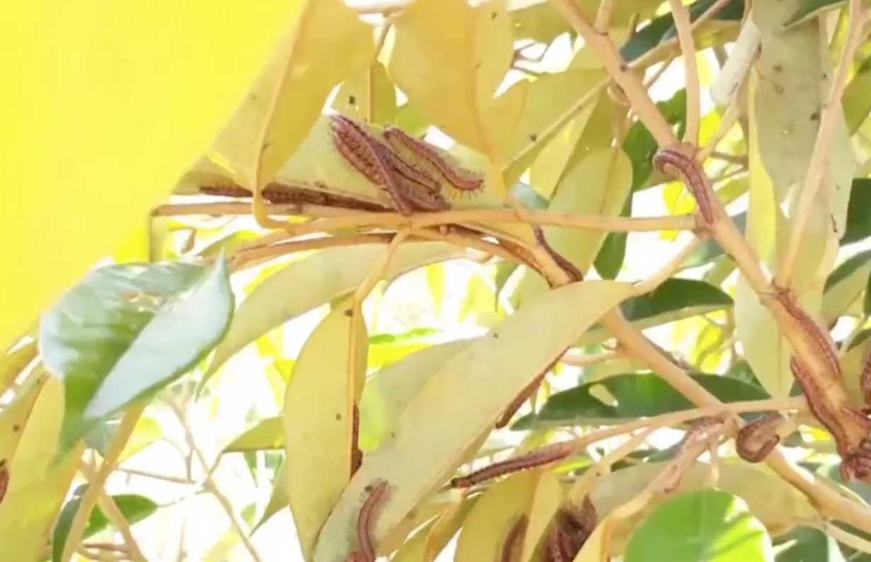 จากการลงพื้นที่พบเจ้าของสวนเร่งฉีดพ่นสารเคมีกำจัดแมลงต้นทุเรียนหมอนทอง อายุ 2 ปีเศษ หลังพบว่ามีกองทัพแมลง 100 ขา จำนวนมหาศาลบุกเข้ามากัดกินใบทุเรียน พบมีแมลงลำตัวเป็นปล้องสีแดงสลับดำ ความยาว 3-5 ซม. มีขาคู่ขนาบตัวคล้าย กิ้งกือ เกาะรวมกันเป็นกลุ่มก้อนกว่า 40-50 ตัว กระจายอยู่ตามใบ และกิ่ง ตลอดจนซอกลำต้นทุเรียน โดยกำลังกัดกินผิวของใบทุเรียน พร้อมถ่ายมูลเหมือนกับหนอนและแมลงศัตรูพืชทั่วไป