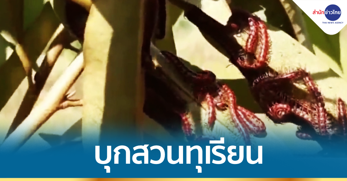 จันทบุรี 28 มิ.ย.- แปลงปลูกทุเรียนหมอนทอง ซอยทุ่งตำอิน หมู่ 3 ต.อ่างคีรี อ.มะขาม จ.จันทบุรี เกษตรกรแจ้งว่ากองทัพแมลง 100 ขา หลายหมื่นตัวบุกเข้ามากัดกินใบทุเรียนเสียหายกว่า 100 ต้น