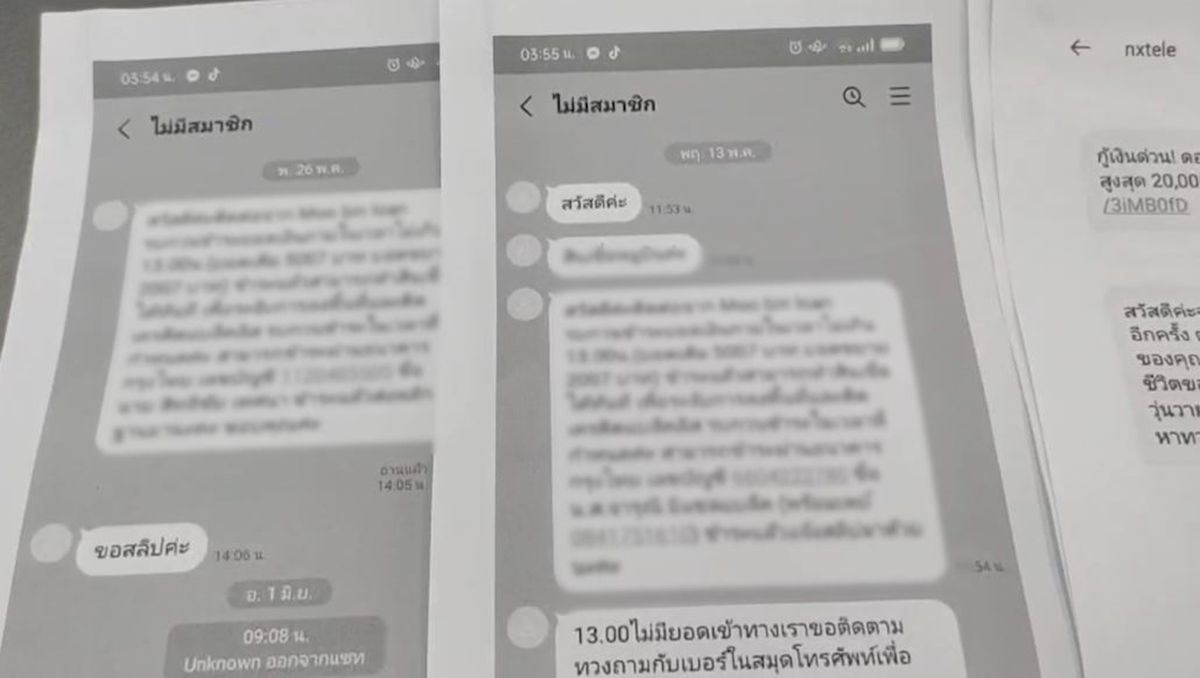 น.ส.นี เล่าว่า ช่วงต้นเดือน มิ.ย. มีแอปพลิเคชันของธนาคารกสิกรไทย เด้งขึ้นมาในโทรศัพท์ บอกว่า ถ้าสนใจกู้เงิน ให้ทำการแอดไลน์ จึงได้ทำการแอดไลน์เข้าไป และกรอกข้อมูลต่างๆ พร้อมถ่ายบัตรประชาชนส่งให้ รูปแบบเหมือนกับธนาคารทุกอย่าง พร้อมส่งเลขบัญชีธนาคารที่มีเงินหมุนเวียน หลังจากนั้นผ่านไป 4 ชั่วโมง ก็มีข้อความเงินเข้ามาในโทรศัพท์ 3,000 บาท แต่เมื่อกดดูพบว่าในบัญชีมีเงินเข้าจริง 1,800 บาท ถูกหักไป 1,200 บาท และภายใน 7 วัน ให้ตนผ่อนให้ครบ 3,001 บาท ตนก็ติดต่อกลับไปว่า แบบนี้ไม่เอา เพราะผ่อนไม่ทัน และได้โอนเงินกลับไป 1,800 บาท เท่ากับยอดที่โอนมาให้ พร้อมขอให้ยกเลิกข้อมูลทั้งหมด และเมื่อวันที่ 16 มิ.ย.ที่ผ่านมา กลับมีเงินโอนเข้ามาอีก 2 ยอด ยอดละกว่า 1,000 บาท และติดต่อต้นทางไม่ได้ แต่เมื่อครบกำหนดชำระ 7 วัน ทางเจ้าของเงินที่โอนเข้ามา กลับโทรมาทวงหนี้ได้