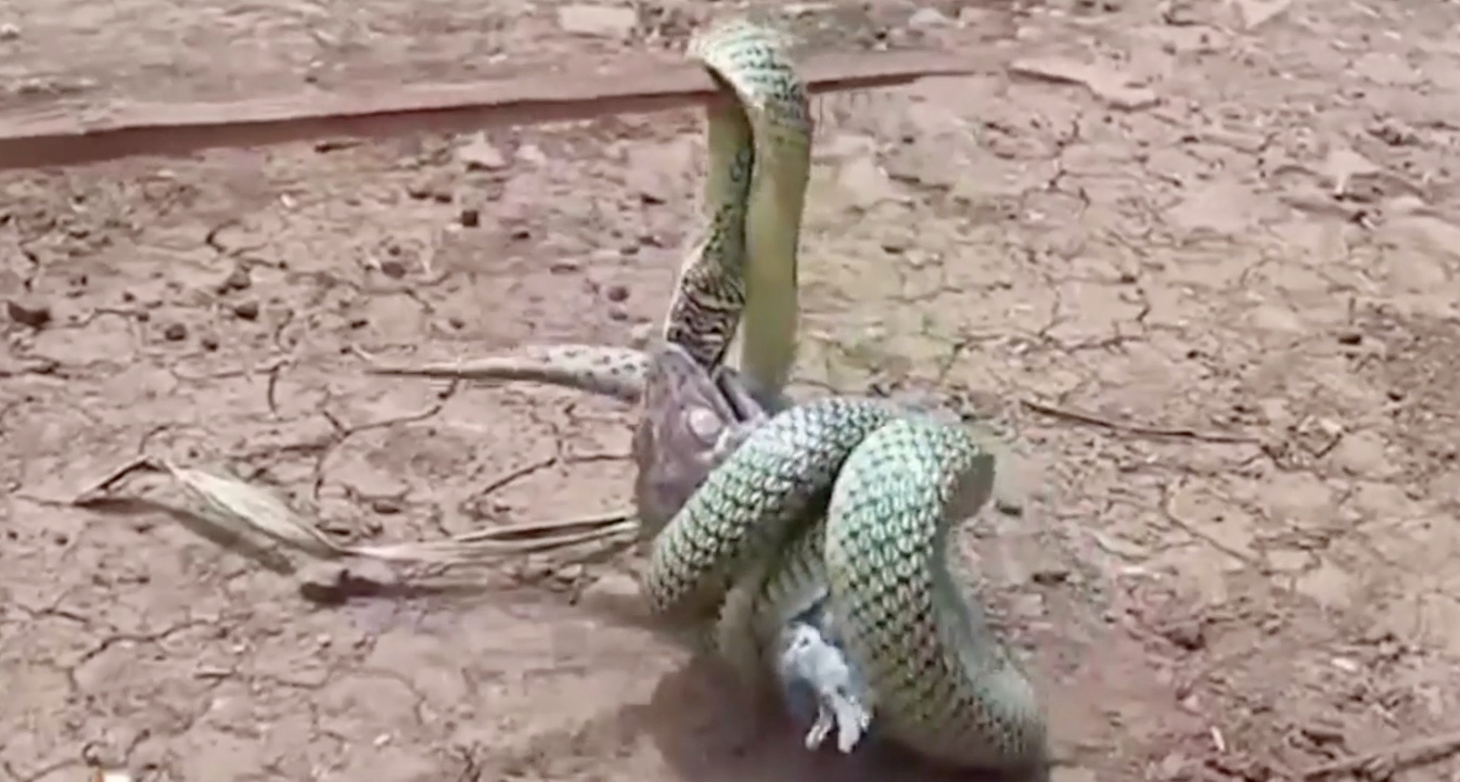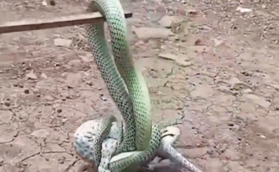 กาญจนบุรี 30 มิ.ย.- มีคำโบราณว่าไว้ หากใครเจองูเขียวกินตับตุ๊กแก จะมีโชค แต่ไปดูงูกับตุ๊กแกคู่นี้ ไม่รู้ว่าใครจะกินใคร เพราะรัดแน่นมาก ต้องใช้เวลาอยู่พักใหญ่กว่าจะช่วยแยกออกจากกันได้