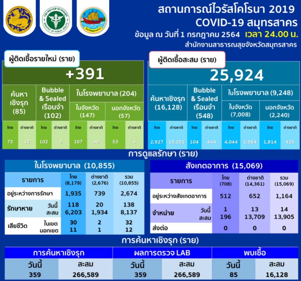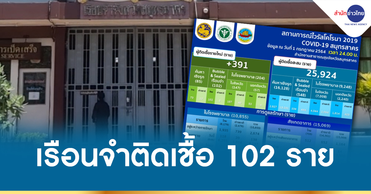 สมุทรสาคร 2 ก.ค.-สมุทรสาครพบผู้ติดเชื้อโควิดในเรือนจำ 102 ราย ขณะนี้ใช้มาตรการ Bubble & Sealed แล้ว ล่าสุด สสจ.เผยพบผู้ติดเชื้อรายใหม่สูงที่สุดในรอบเกือบ 3 สัปดาห์ รวมทั้งสิ้น 391 ราย