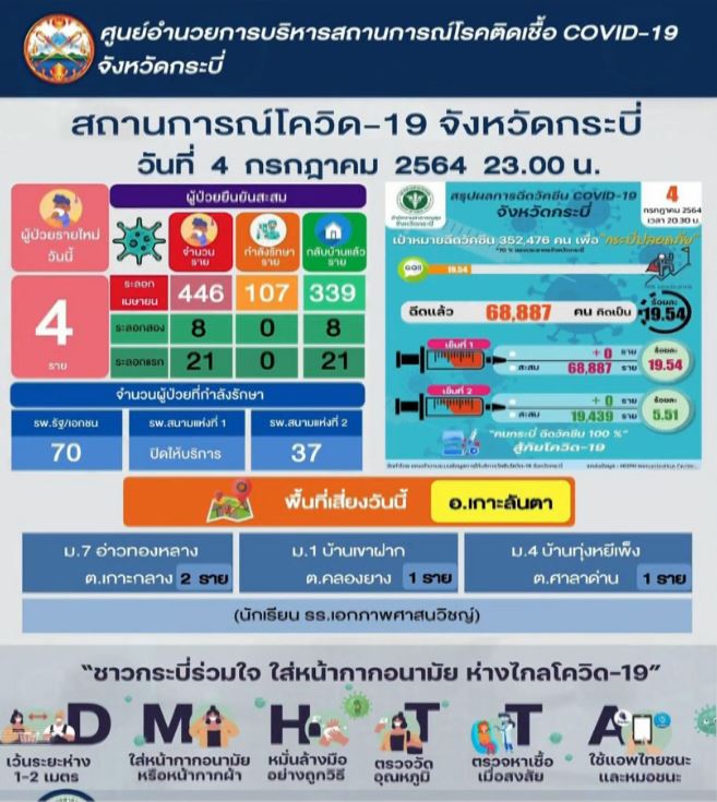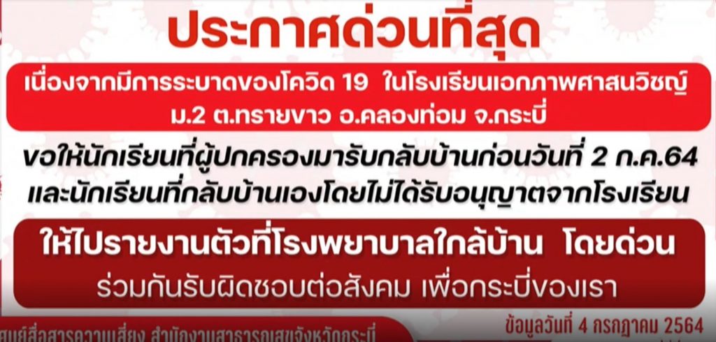 กระบี่ประกาศให้นักเรียนโรงเรียนเอกภาพศาสนวิชญ์ หรือปอเนาะทรายขาว ที่ผู้ปกครองรับกลับบ้านไปวันที่ 2 ก.ค.ที่ผ่านมา ให้ไปรายงานตัวที่โรงพยาบาลใกล้บ้านโดยด่วน หลังล่าสุดพบนักเรียนที่กลับบ้านติดเชื้อเพิ่มอีก 4 คน รวมเป็น 20 คนแล้ว และรอผลตรวจกลุ่มเสี่ยงกว่า 500 คน