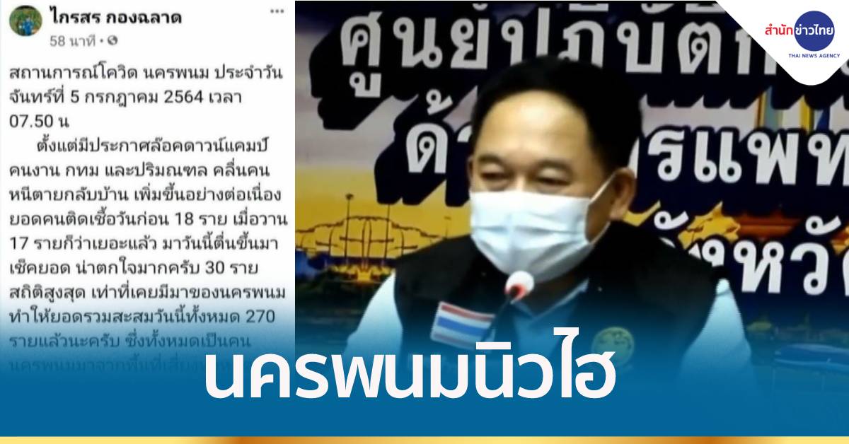 นายไกรสร กองฉลาด ผู้ว่าฯ นครพนม โพสต์เฟซบุ๊กส่วนตัว เมื่อช่วงเช้า ว่า “ตั้งแต่มีประกาศล็อกดาวน์แคมป์คนงาน กทม. และปริมณฑล คลื่นคนหนีตายกลับบ้านเพิ่มขึ้นอย่างต่อเนื่อง ยอดคนติดเชื้อวันก่อน 18 ราย เมื่อวาน 17 รายก็ว่าเยอะแล้ว มาวันนี้ตื่นขึ้นมา เช็กยอดน่าตกใจมากครับ 30 ราย สถิติสูงสุด เท่าที่เคยมีมาของนครพนม ทำให้ยอดรวมสะสมวันนี้ทั้งหมด 270 รายแล้วนะครับ