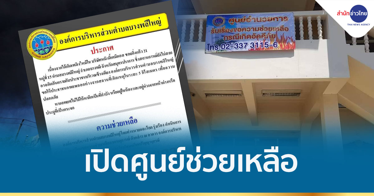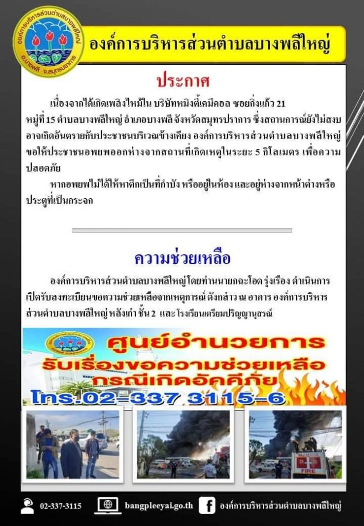 สมุทรปราการ 5 ก.ค.-ศูนย์ช่วยเหลือประชาชน ของ อบต.บางพลีใหญ่ พร้อมให้ความช่วยเหลือผู้ได้รับผลกระทบจากเหตุไฟไหม้โรงงานเม็ดโฟม