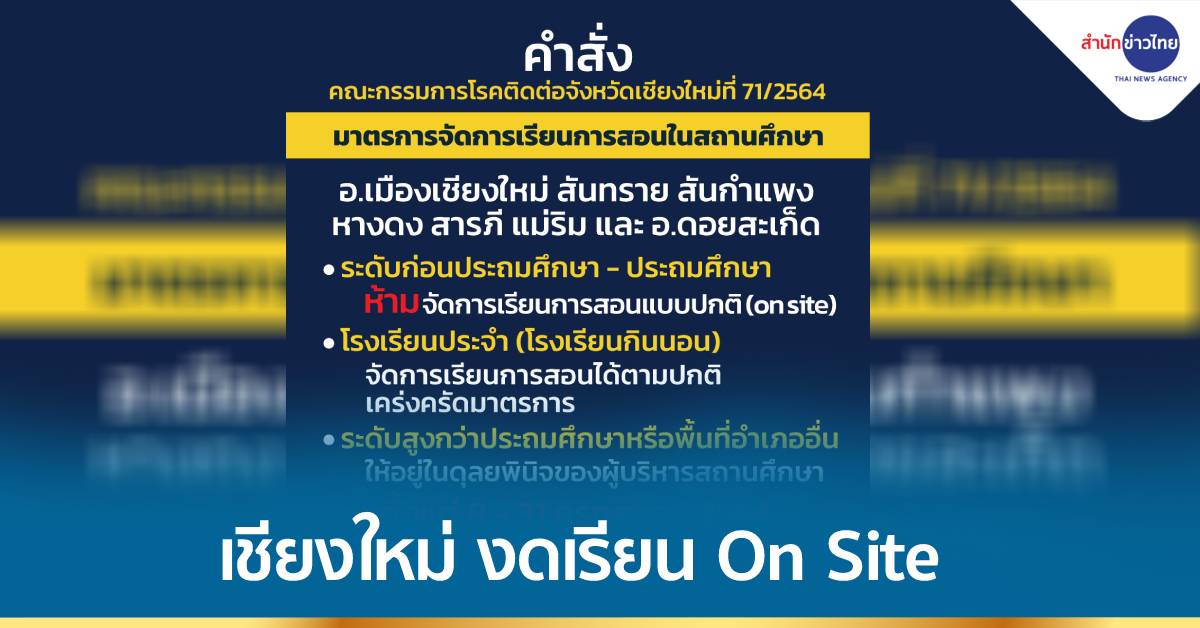 วันที่ 6 ก.ค. 64 ที่ประชุมคณะกรรมการโรคติดต่อจังหวัดเชียงใหม่ มีมติให้ออกคำสั่งคณะกรรมการโรคติดต่อจังหวัดเชียงใหม่ ที่ 71/2564 เรื่อง มาตรการจัดการเรียนการสอนในสถานศึกษา โดยสาระสำคัญของคำสั่ง สั่งให้ โรงเรียนในพื้นที่ อ.เมืองเชียงใหม่ สันทราย สันกำแพง หางดง สารภี แม่ริม และ อ.ดอยสะเก็ด ห้ามจัดการเรียนการสอนแบบปกติ ซึ่งเรียนโดยใช้อาคารเรียนหรือเรียนในห้องเรียน ในสถานที่ของโรงเรียน หรือแบบ On Site ในระดับชั้นก่อนประถมศึกษา และระดับประถมศึกษา
