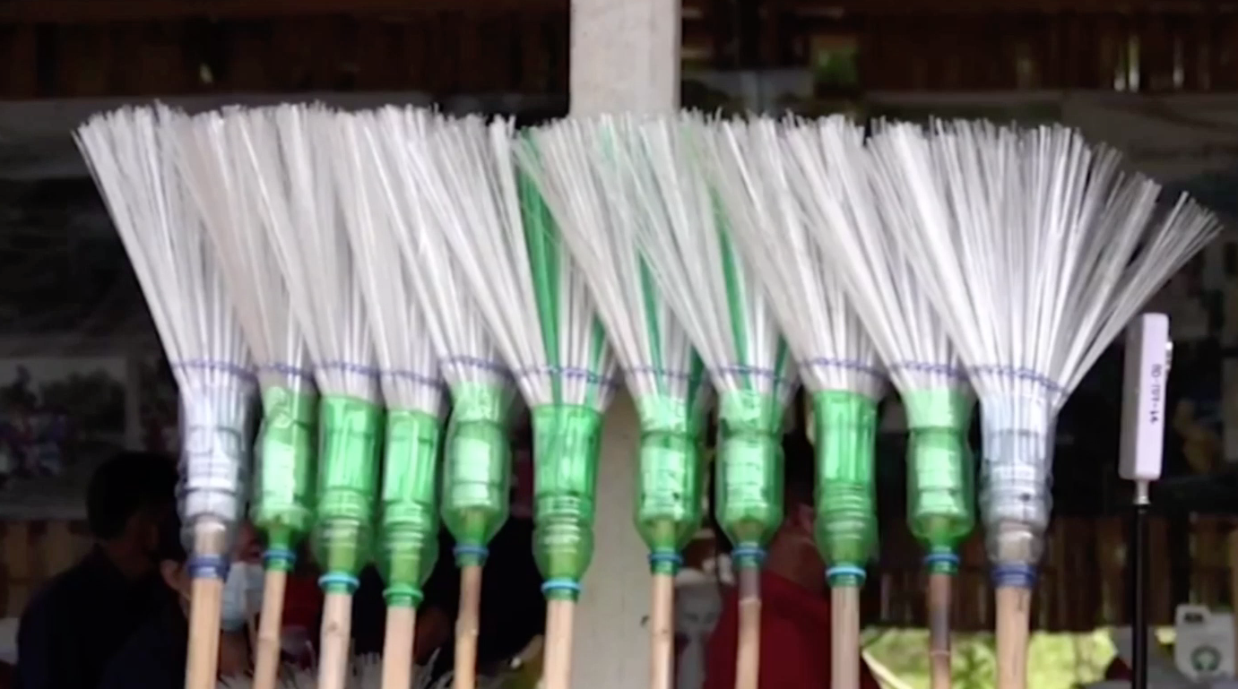 ขอนแก่น 7 ก.ค.- สมาชิกกลุ่มไม้กวาดรักษ์โลก จ.ขอนแก่น นำขวดน้ำอัดลมพลาสติกจากธนาคารขยะมาดัดแปลงทำไม้กวาดสร้างรายได้