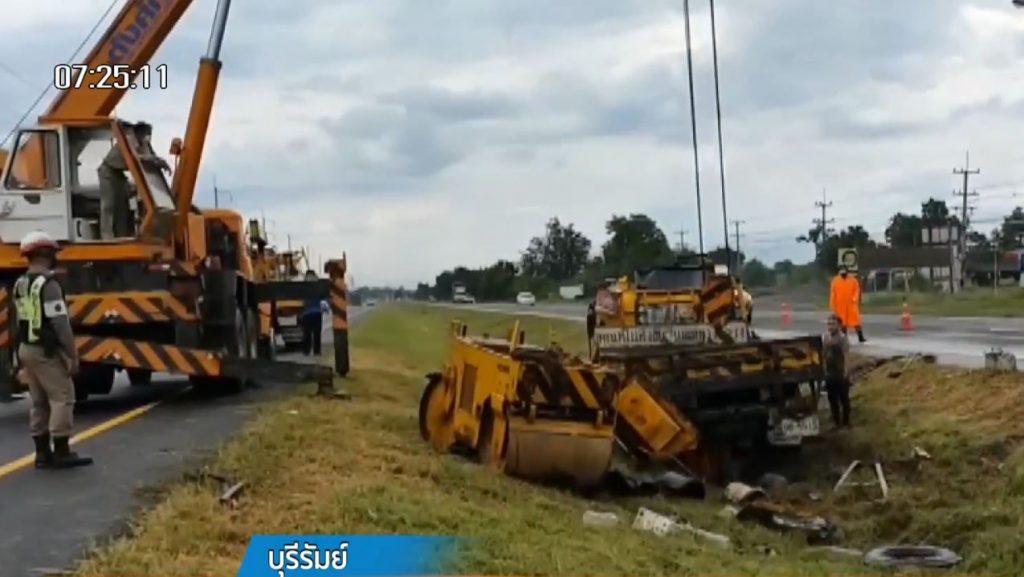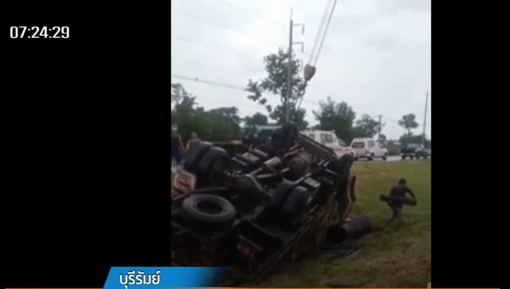 บุรีรัมย์ 8 ก.ค.-รถหกล้อกรมทางหลวง ประจำหมวดทางหลวงประโคนชัย จ.บุรีรัมย์ บรรทุกคนงานกลับจากซ่อมถนน ถูกรถกระบะปาดหน้ากระชั้นชิด เสียหลักพลิกคว่ำ ทับคนงานเสียชีวิต 2 เจ็บอีก 7