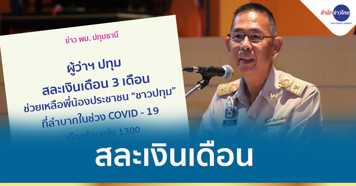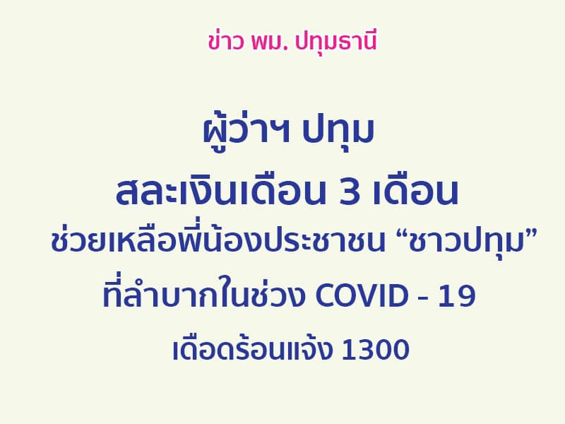 ปทุมธานี 8 ก.ค.-สนง.พมจ ปทุมธานี โพสต์เรื่องราวดีๆ ของผู้ว่าฯ ปทุมธานี สละเงินเดือน 3 เดือน ช่วยเหลือพี่น้องประชาชน “ชาวปทุม” ที่ลำบากในช่วง COVID – 19 เดือดร้อนแจ้ง 1300