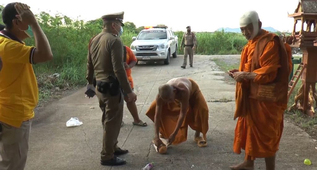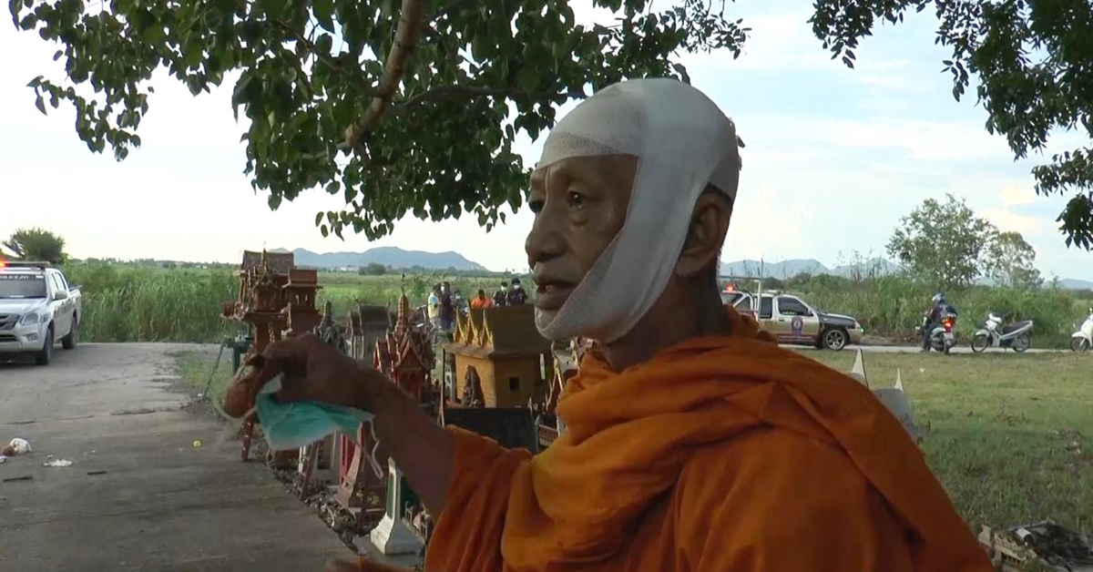 สอบถามพระธงชัย เล่าว่า มีคนร้ายเป็นชาย อายุประมาณ 25-30 ปี หญิงอายุประมาณ 30 ปี และเด็กชาย อายุประมาณ 9-10 ขวบ ไม่สวมเสื้อ ห่มผ้าขนหนูสีเหลือง ทำทีเข้ามาขออาหารกินที่กุฏิ เมื่อเผลอได้คว้าอังสะที่ถอดวางไว้บนโต๊ะไป พระธงชัยหันไปเห็นพอดี จึงร้องบอกว่าอย่าทำแบบนั้น ของพระมันบาป แต่ทั้ง 3 คนไม่ฟัง คว้าวิ่งออกไปทางหลังกุฏิ เพื่อขึ้นรถจักรยานยนต์หลบหนี เป็นจังหวะที่พระธงชัยวิ่งตามมาถึง เพื่อขออังสะคืน ยื้อแย่งกันอยู่สักพัก แต่กลับถูกทั้ง 3 คน รุมทำร้าย โดยมีคนเห็นเด็กใช้ขวดตีที่ศีรษะของพระ ก่อนล้วงอังสะคว้าเงินสดกว่า 800 บาท บัตรเอทีเอ็ม และบัตรอื่นๆ ติดไปด้วย