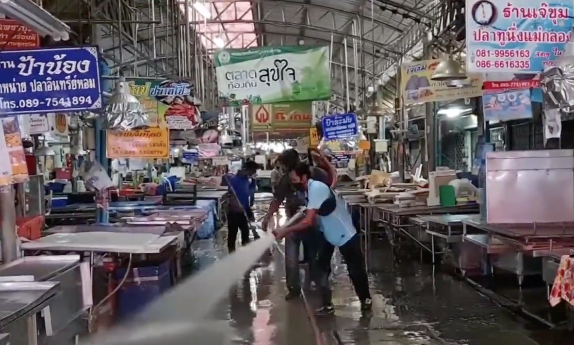 สมุทรสงคราม 14 ก.ค.- ทางเทศบาลเมืองสมุทรสงคราม ปิดตลาดสดแม่กลอง และตลาดใกล้เคียง ล้างทำความสะอาดฆ่าเชื้อ สร้างความมั่นใจให้กับผู้บริโภค 2 วัน ก่อนเตรียมเปิดตลาดวันที่ 15 ก.ค.นี้