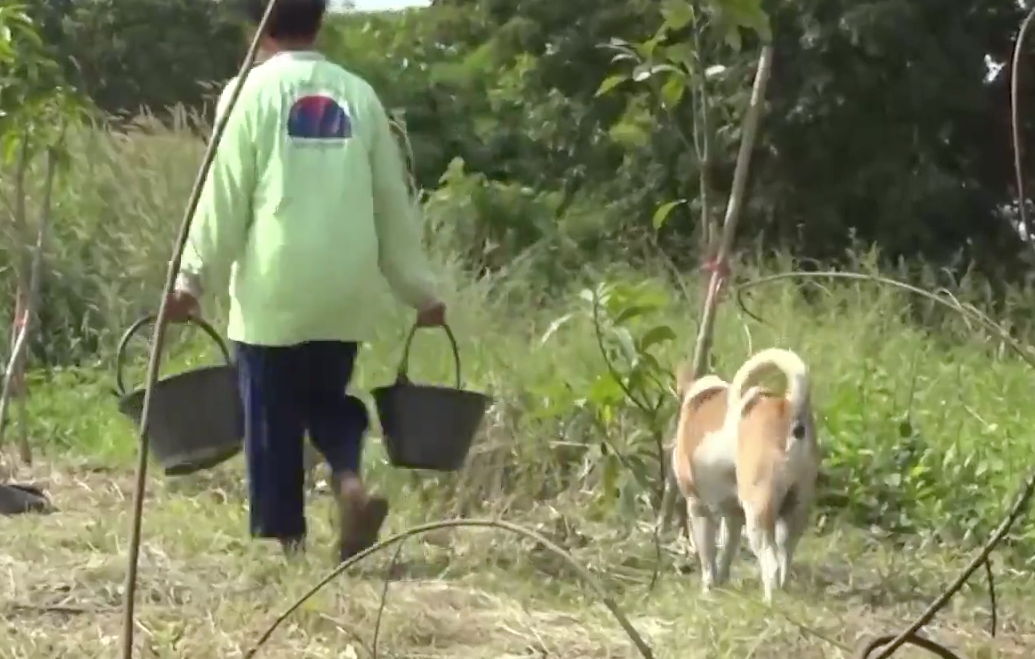 บางวันที่ไม่มีใครอยู่บ้านสั่ง “จ่อยเฝ้าบ้าน” ก็ไม่เถลไถล จะคอยตรวจตราอยู่รอบบ้าน พอเห็นคนแปลกหน้าก็จะเห่า อย่างวันนี้ก็พามารดน้ำต้นไม้ด้วยในสวนที่อยู่ห่างบ้านประมาณ 1 กิโลเมตร โดยมาถึงก็จะเปิดน้ำใส่ถัง พอน้ำเต็มจ่อยก็จะคาบถังหิ้วไปที่สวนผัก เพื่อรอให้นางประเทืองเอาน้ำไปรดต้นไม้