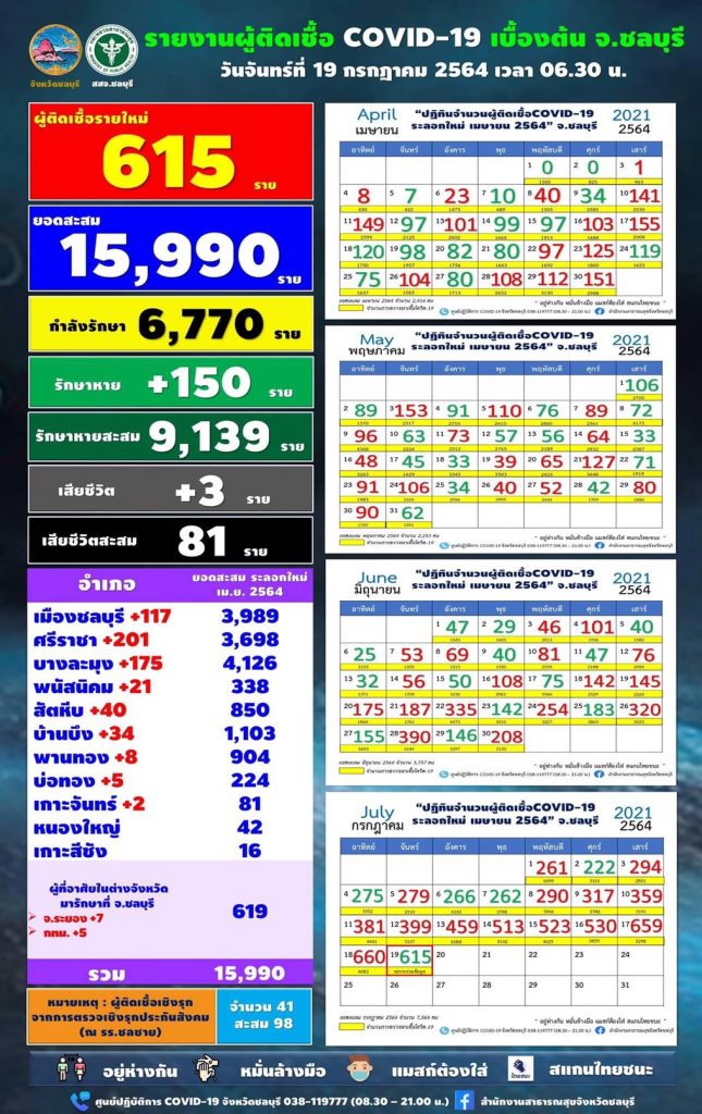 สำนักงานประชาสัมพันธ์จังหวัดชลบุรี รายงานสถานการณ์ COVID-19 พบผู้ติดเชื้อเพิ่ม 615 คน ยอดติดเชื้อสะสม 15,990 คน ยังรักษาตัวอยู่ 6,770 คน รักษาหายเพิ่ม 150 คน หายป่วยสะสม 9,139 คน เสียชีวิตเพิ่ม 3 คน เสียชีวิตสะสม 81 คน ขณะที่คณะกรรมการโรคติดต่อจังหวัดชลบุรี ออกคำสั่งที่ 59/2564 ลงวันที่ 18 กรกฎาคม 2564 เนื่องจากขณะนี้พบว่ามีการแพร่ระบาดของโรคติดเชื้อโควิด- 19 ภายในสถานประกอบการและแคมป์คนงานก่อสร้างในพื้นที่จังหวัดชลบุรี ดังนั้นเพื่อเป็นการควบคุมสถานการณ์การระบาดของโรคให้อยู่ในวงจำกัดไม่ให้การแพร่ระบาดของโรคกระจายเป็นวงกว้าง จึงมีคำสั่งดังต่อไปนี้