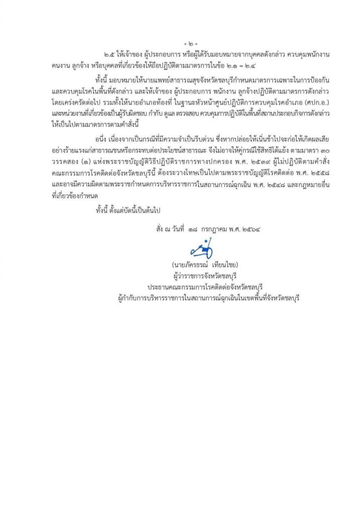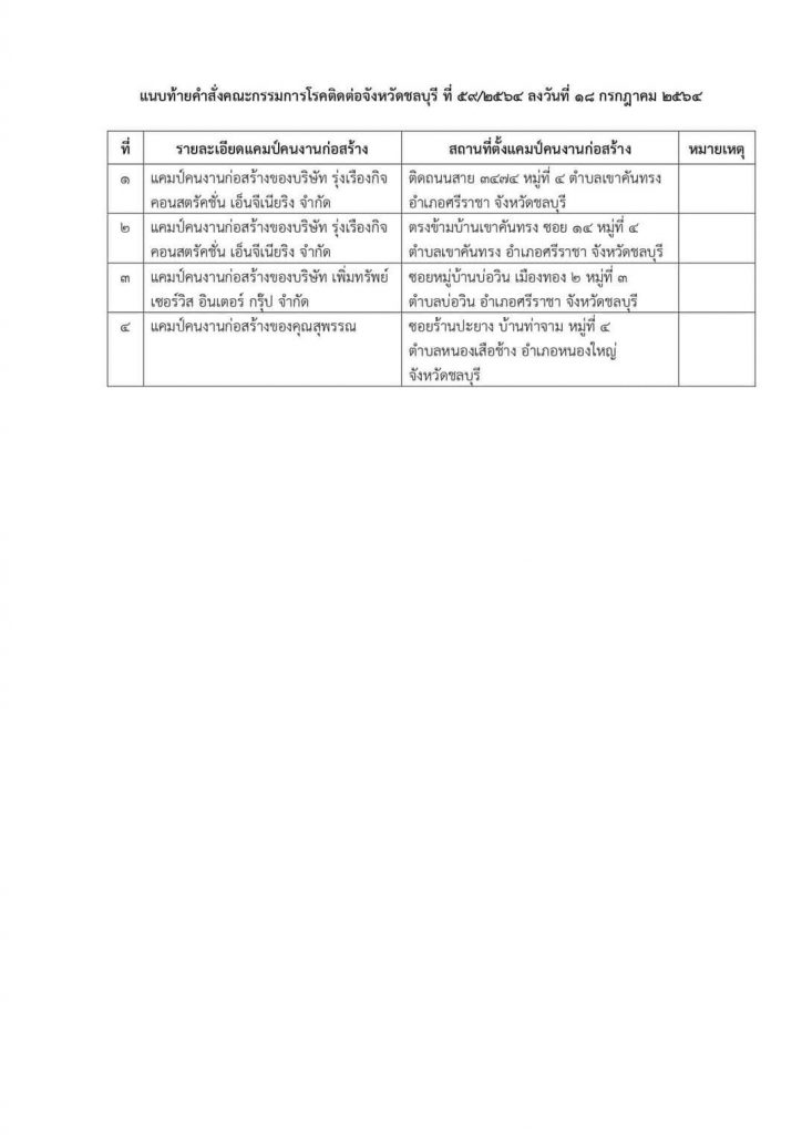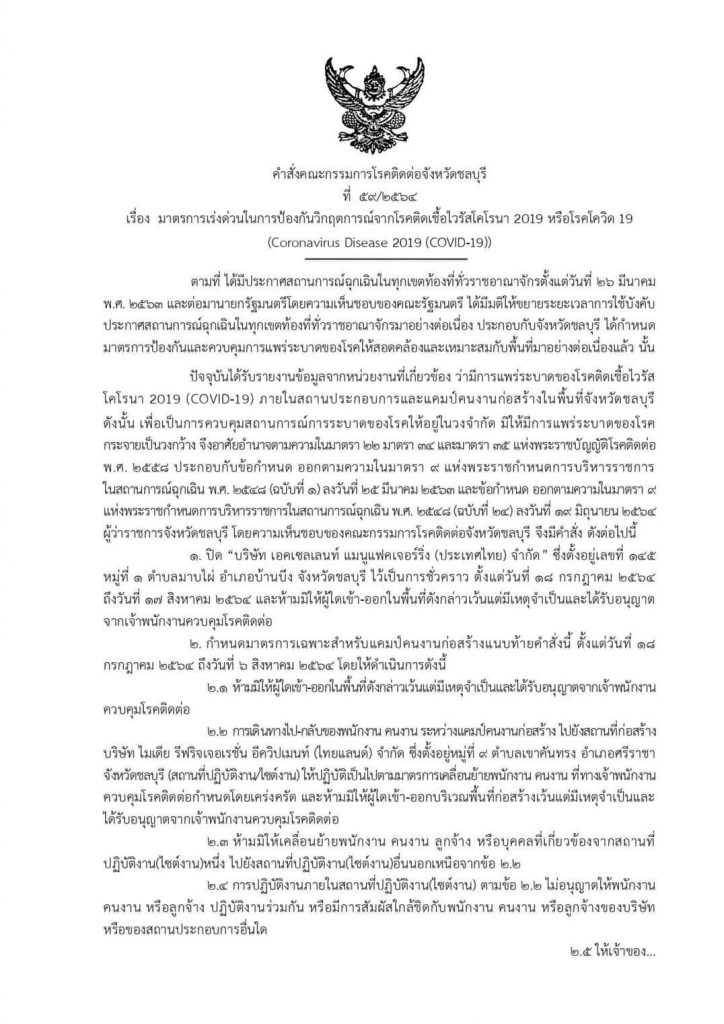 1.ปิด บริษัท เอคเซลเลนท์ แมนูแฟคเจอร์ริ่ง (ประเทศไทย) จำกัด ซึ่งตั้งอยู่ตำบลมาบไผ่ อำเภอบ้านบึง จังหวัดชลบุรีเป็นการชั่วคราว ตั้งแต่วันที่ 18 กรกฎาคม 2564 ถึงวันที่ 27 สิงหาคม 2564 และห้ามมิให้ผู้ใดเข้า-ออกในพื้นที่ดังกล่าวเว้นแต่มีเหตุจำเป็นและได้รับอนุญาตจากเจ้าพนักงานควบคุมโรคติดต่อ