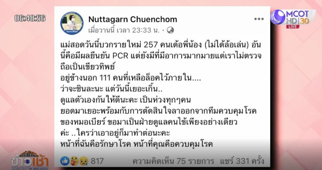 จากกรณีแพทย์หญิงณัฐกานต์ ชื่นชม หรือหมอเบียร์ อายุรกรรมโรคติดเชื้อโรงพยาบาลแม่สอด จังหวัดตาก โพสต์ข้อความใน Facebook ว่า “แม่สอดวันนี้บวกรายใหม่ 257 คนเด้อพี่น้อง (ไม่ได้ล้อเล่น) อันนี้คือมีผลยืนยัน PCR แต่ยังมีที่มีอาการมากมายแต่เราไม่ตรวจถือเป็นเขียวทิพย์ อยู่ข้างนอก 111 คน ที่เหลือล็อกไว้ภายใน…ว่าจะชินละนะ แต่วันนี้เยอะเกิ้น…ดูแลตัวเองกันให้ดีนะคะ เป็นห่วงทุกๆ คน ยอดมาเยอะพร้อมกับการตัดสินใจลาออกจากทีมควบคุมโรคของหมอเบียร์ ขอมาเป็นฝ่ายดูแลคนไข้เพียงอย่างเดียวค่ะ…ใครว่าเอาอยู่ก็มาทำต่อนะคะ หน้าที่ฉันคือรักษาโรค หน้าที่คุณคือควบคุมโรค”