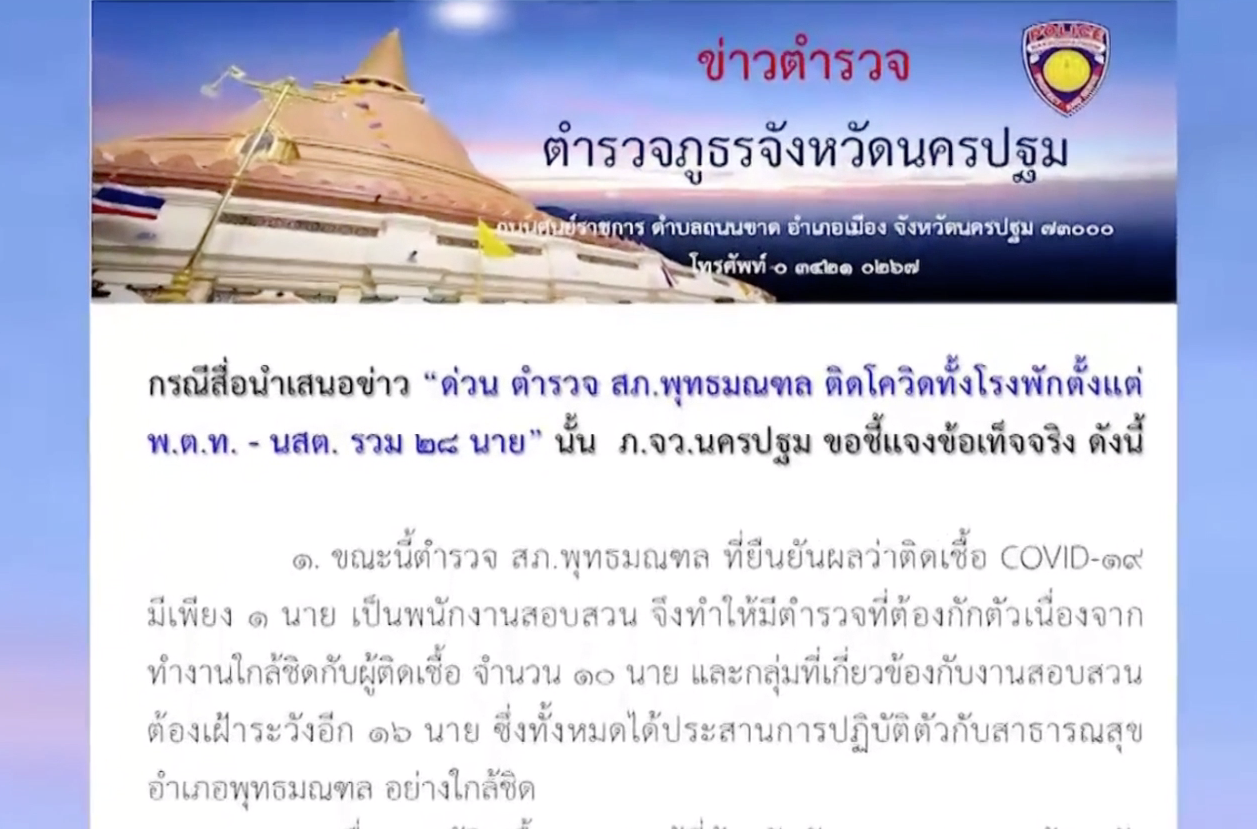 ด้านกองบังคับการตำรวจภูธรจังหวัดนครปฐม ชี้แจงกรณีสื่อนำเสนอข่าว “ด่วน!! ตำรวจ สภ.พุทธมณฑล ติดโควิดทั้งโรงพักตั้งแต่ พ.ต.ท. – นสต. รวม ๒๘ นาย” ว่าจริง ๆ แล้ว มีตำรวจ สภ.พุทธมณฑล ยืนยันผลว่าติดเชื้อโควิด-19 เพียง 1 นาย เป็นพนักงานสอบสวน จึงมีการกักตัวผู้ที่ทำงานใกล้ชิดกับผู้ติดเชื้อ จำนวน 10 นาย และกลุ่มที่เกี่ยวข้องกับงานสอบสวนต้องเฝ้าระวังอีก 16 นาย