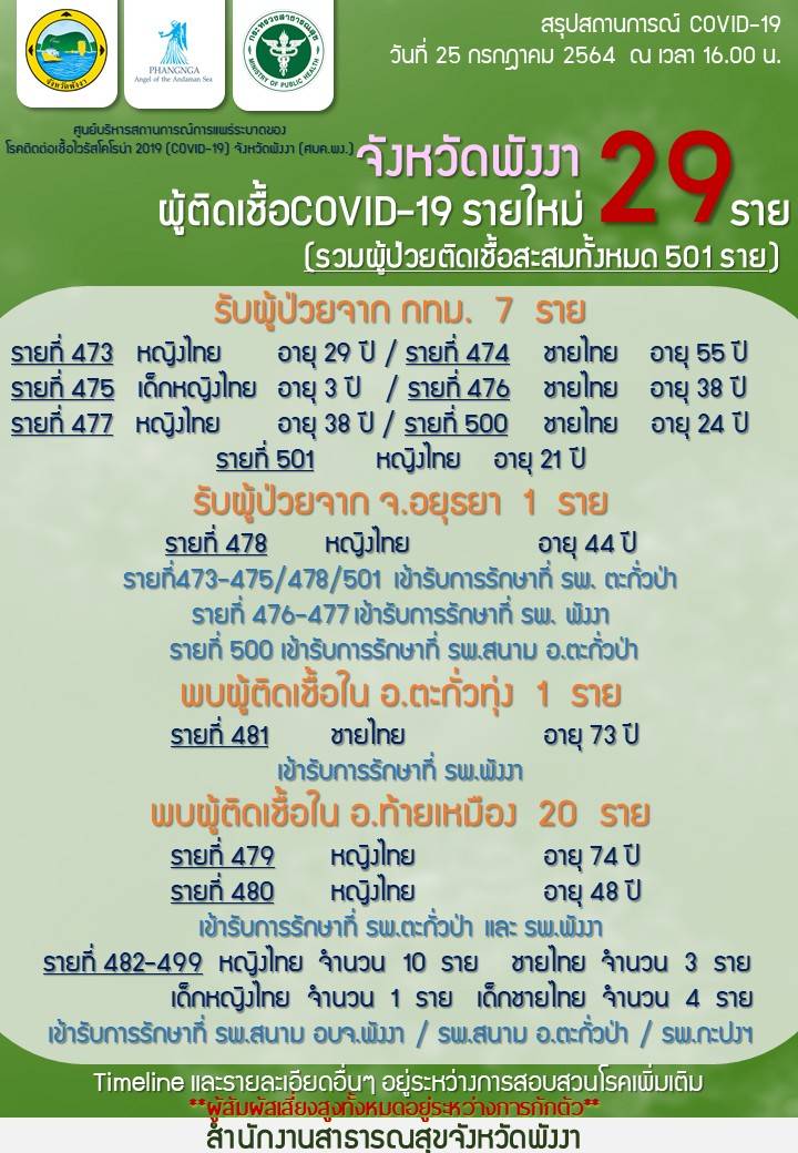 ขณะที่ศูนย์บริหารสถานการณ์การแพร่ระบาดของโรคติดเชื้อไวรัสโคโรนา 2019 จังหวัดพังงา (ศบค.พง.) รายงานสถานการณ์การแพร่ระบาดของโรคติดเชื้อโควิด-19 ประจำวันที่ 25 กรกฎาคม 2564 เวลา 16.00 น. พบผู้ป่วยรายใหม่ 29 ราย อ.ท้ายเหมือง คลัสเตอร์บ้านบางคลี 20 ราย อ.ตะกั่วทุ่ง 1 ราย รับผู้ป่วยจากกรุงเทพฯ 7 ราย จากพระนครศรีอยุธยา 1 ราย รวมผู้ป่วยสะสมระลอกใหม่ 501 ราย. – สำนักข่าวไทย