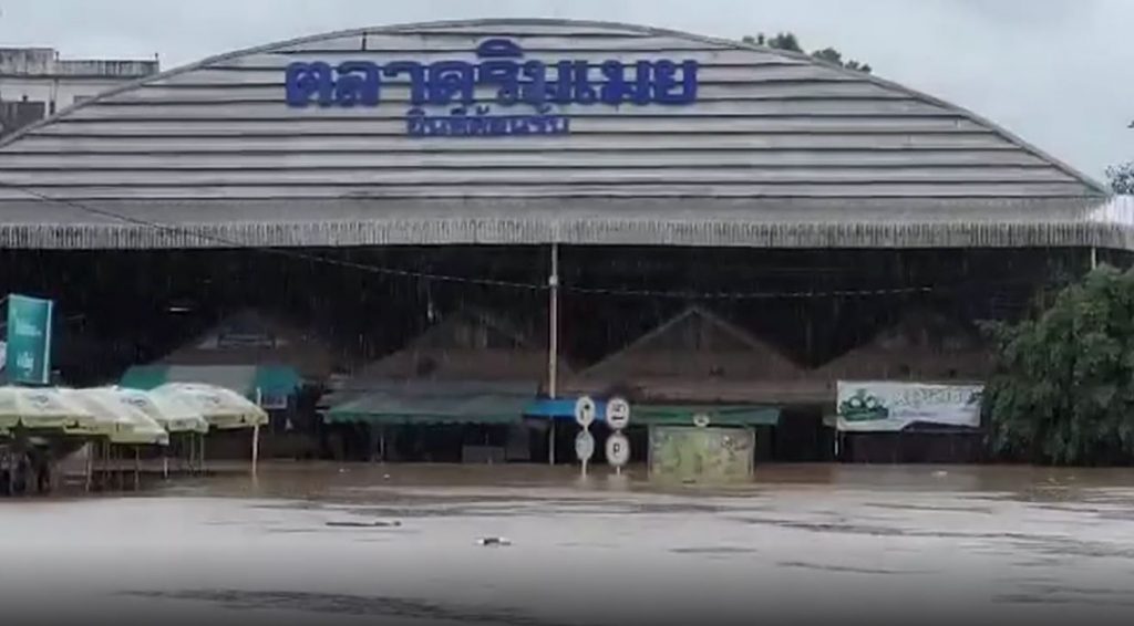 ตาก 27 ก.ค.-ฝนตกหนักนานนับสัปดาห์ ส่งผลให้น้ำจากแม่น้ำเมยไหลล้นตลิ่งเข้าท่วมตลาดริมเมย อ.แม่สอด จ.ตาก สูงกว่า 1 เมตร พ่อค้า-แม่ค้า เร่งขนย้ายสิ่งของขึ้นที่สูง