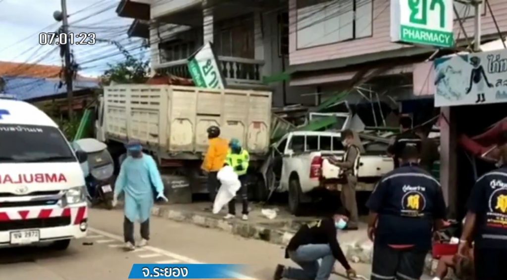 ระยอง 28 ก.ค.-รถสิบล้อบรรทุกดิน พุ่งชนรถกระบะ ก่อนเสียหลักพุ่งเข้าร้านขายยาริมถนน อัดร่างชาวต่างชาติ และชาวบ้านบาดเจ็บ ส่วนคนขับกระบะ และลูกชายวัย 7 ขวบ เจ็บเล็กน้อย