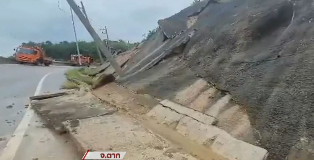 สถานการณ์น้ำท่วมในเขตชายแดนอำเภอแม่สอด จ.ตาก ฝนตกหนักทั้งคืนถึงเช้าวันนี้ ทำให้ดินภูเขาอุ้มน้ำไม่ไหว สไลด์ลงมาบนถนนทางหลวงแผ่นดินหมายเลข 130 เส้นทางแม่สอด-สะพานมิตรภาพไทย-เมียนมาแห่งที่ 2 ดินภูเขายังดันแผ่นคอนกรีตกันหน้าผาพังถล่มไหลลงมากองริมถนน ทำให้เสาไฟฟ้าแรงสูงเอียงหวิดโค่นบนถนน สร้างความหวาดกลัวให้ผู้ใช้รถ เจ้าหน้าที่การไฟฟ้าส่วนภูมิภาคได้ปิดการจราจรชั่วคราว และตัดกระแสไฟฟ้าชั่วคราวในจุดเกิดเหตุเพื่อป้องกันอันตราย ก่อนจะเร่งซ่อมแซมและติดตั้งเสาไฟต้นใหม่