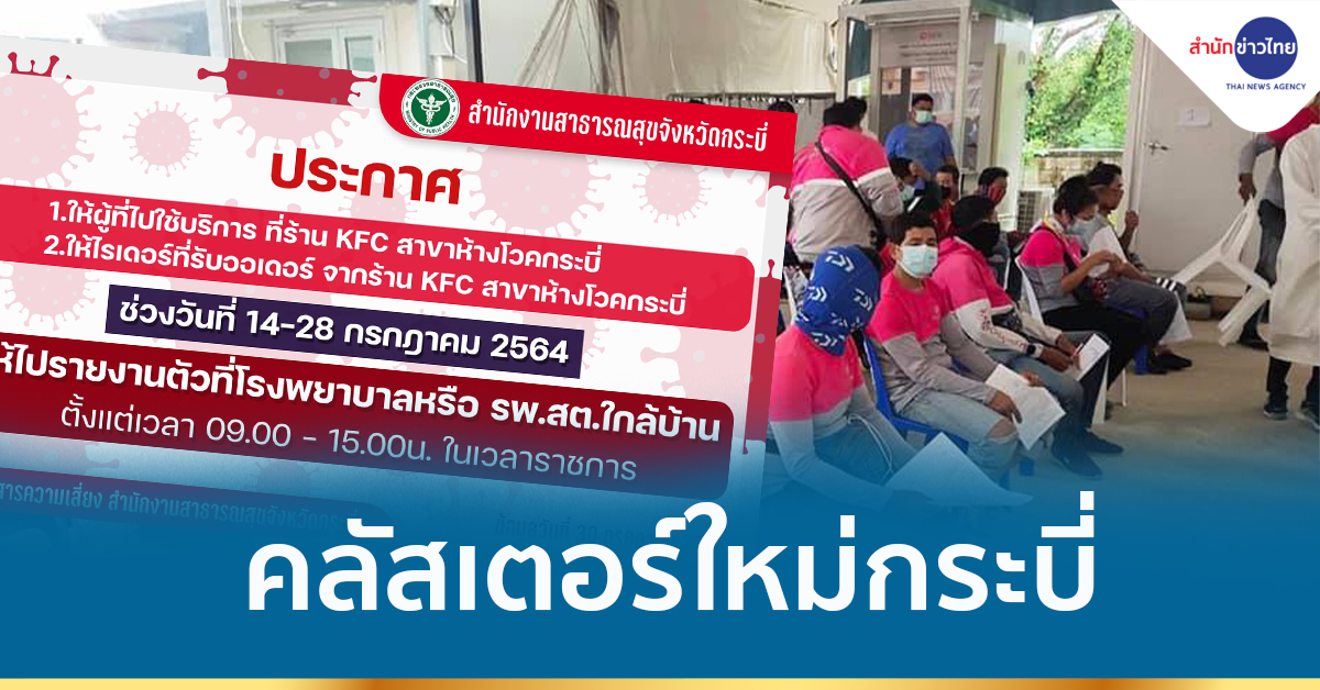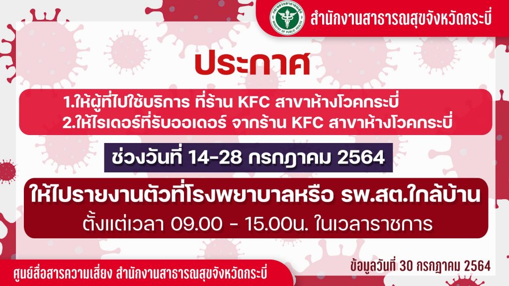 วันที่ 31 ก.ค.64 สำนักงานสาธารณสุข จ.กระบี่ ได้ประกาศให้ผู้ที่เข้าไปใช้บริการร้านเคเอฟซี สาขาห้างโวคกระบี่ อ.เมือง จ.กระบี่ ในช่วงวันที่ 14-28 ก.ค.64 ให้ไปรายงานตัวที่โรงพยาบาลหรือ รพ.สต.ใกล้บ้านตั้งแต่เวลา 09.00 – 15.00 น. ในเวลาราชการ หลังพบผู้ติดเชื้อคลัสเตอร์ร้านเคเอฟซี สาขาห้างโวคกระบี่ 7 ราย ทีมสอบสวนโรค สำนักงานสาธารณสุขอำเภอเมืองกระบี่ ร่วมกับโรงพยาบาลกระบี่ อ.เมืองกระบี่เร่งตรวจคัดกรองกลุ่มผู้สัมผัสที่มีประวัติตามไทม์ไลน์ของผู้ป่วยยืนยันได้แก่กลุ่มผู้ส่งอาหาร(ไรเดอร์) ซึ่งเป็นผู้สัมผัสเสี่ยงต่ำ รายงานตัวและเฝ้าระวังอาการตัวเอง 14 วันอยู่ที่บ้าน หากมีอาการสามารถตรวจคัดกรองได้ที่ รพ.กระบี่