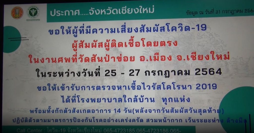 คณะกรรมการโรคติดต่อจังหวัดเชียงใหม่ ออกประกาศให้คนที่ไปร่วมงานศพ วัดสันป่าข่อย อำเภอเมืองเชียงใหม่ ระหว่างวันที่ 25-27 กรกฎาคม รีบไปตรวจหาเชื้อโควิดเป็นการด่วน เนื่องจากพบผู้ที่เดินทางมาจากกรุงเทพฯ ติดเชื้อโควิด และนำมาติดเครือญาติที่มาร่วมงานศพอีก 4 คน