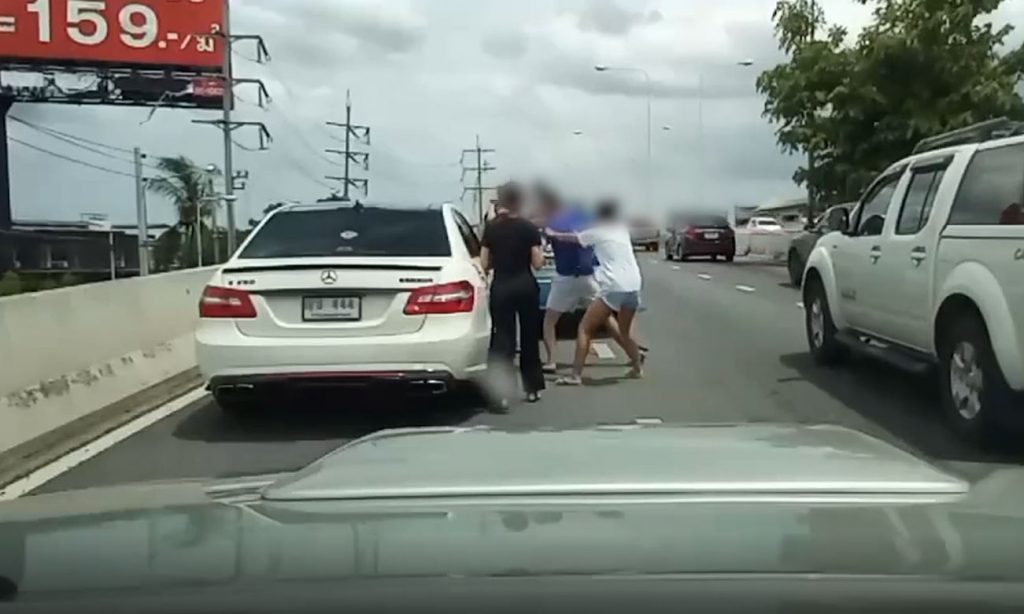 นายสุรศักดิ์ กล่าวว่า วันเกิดเหตุ ขับรถไปทำธุระที่ปั๊มน้ำมันแห่งหนึ่ง ย่านถนนราชพฤกษ์ หลังธุระเสร็จ กำลังขับรถออกจากปั๊ม เห็นรถของคู่กรณีขับรถออกมาเหมือนกัน แค่ปาดหน้ากัน แต่ไม่ได้มีการบีบแตร กระทั่งขับรถมาถึงทางลงอุโมงค์วงเวียนพระราม 5 สังเกตว่ารถของคู่กรณียังคงขับตามมา ในลักษณะจี้ท้ายตลอด จึงชะลอรถ ให้รถคู่กรณีแซงหน้าขึ้นทางเลนขวา ส่วนรถตนอยู่เลนซ้าย ก่อนขึ้นสะพาน รถคู่กรณีขับปาดหน้าและเบรกกะทันหัน จนรถตนเบรกไม่อยู่พุ่งชนท้าย จากนั้นคนขับรถคู่กรณีซึ่งเป็นผู้ชายได้ลงมาจากรถและวิ่งเข้ามาชกที่ใบหน้า จนเกิดการต่อสู้ป้องกันตัวกันขึ้น ชายดังกล่าวกลับไปที่รถเอาค้อนมาตีอีกครั้ง ตนเห็นมีบาดแผลที่ใบหน้าคู่กรณี จึงบอกว่าพอได้แล้ว แต่ชายดังกล่าวกลับวิ่งไปแย่งกระเป๋าสะพายของภรรยาตน ที่นั่งอยู่ในรถออกไปขว้างทิ้งและยังตบหน้าภรรยา 1 ครั้ง ก่อนที่แฟนของชายดังกล่าว ที่นั่งรถมาด้วยกันจะวิ่งเข้ามาห้ามและพาตัวกลับขึ้นรถไป ซึ่งเรื่องก็น่าจะจบแล้ว แต่อยู่ๆ ก็ถอยรถมาชนก่อนจะขับรถหลบหนีไป